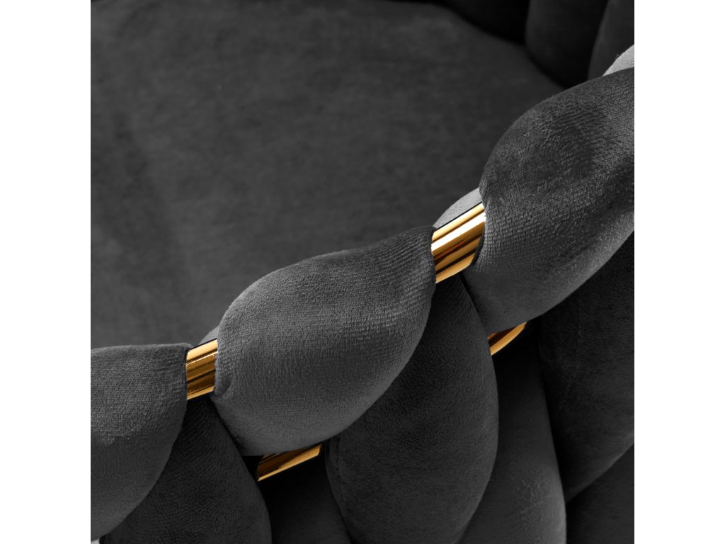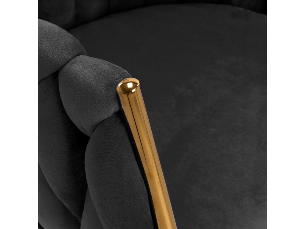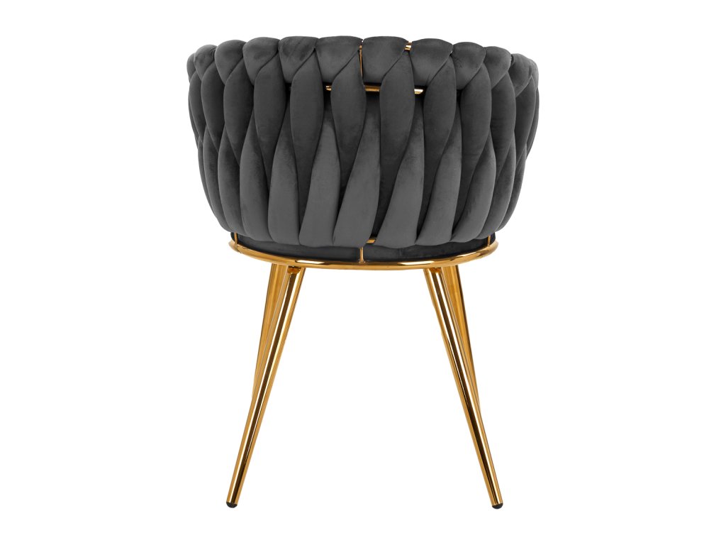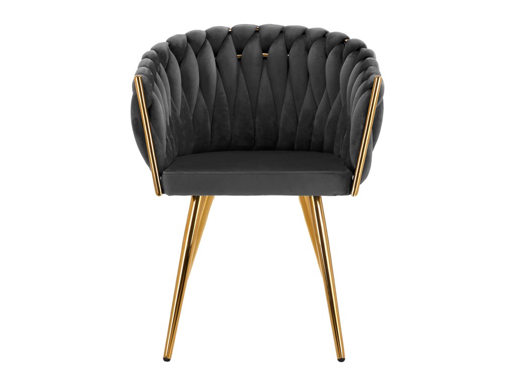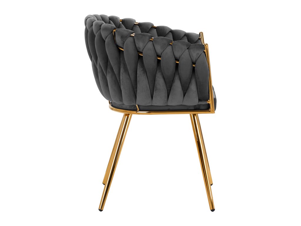 Die angenehme Samtpolsterung, die dekorativ geflochtene Rückenlehne und das stabile goldfarbene Gestell machen diesen Kosmetikstuhl zu einem stilvollen Highlight. Die leicht abgerundete, ergonomisch geformte Rückenlehne bietet optimalen Halt, während die bequem platzierten Armlehnen für eine entspannte Sitzposition sorgen.