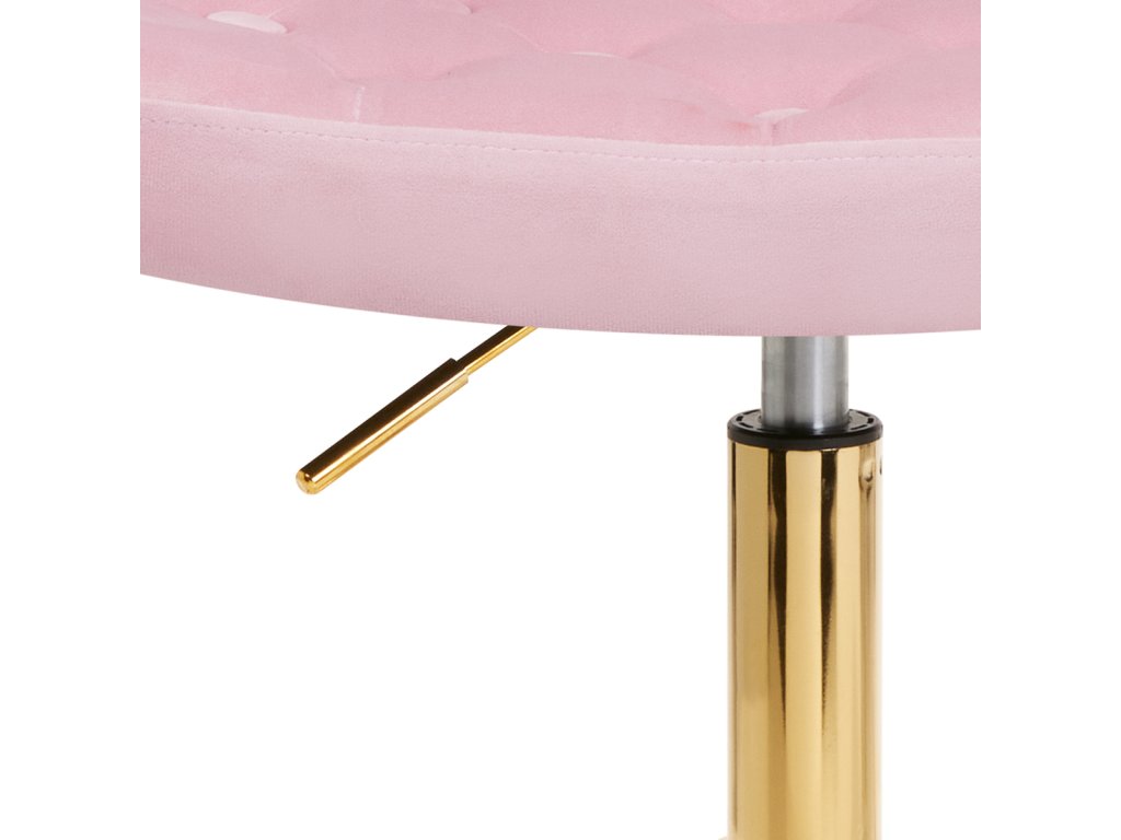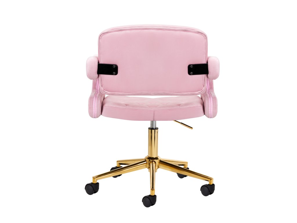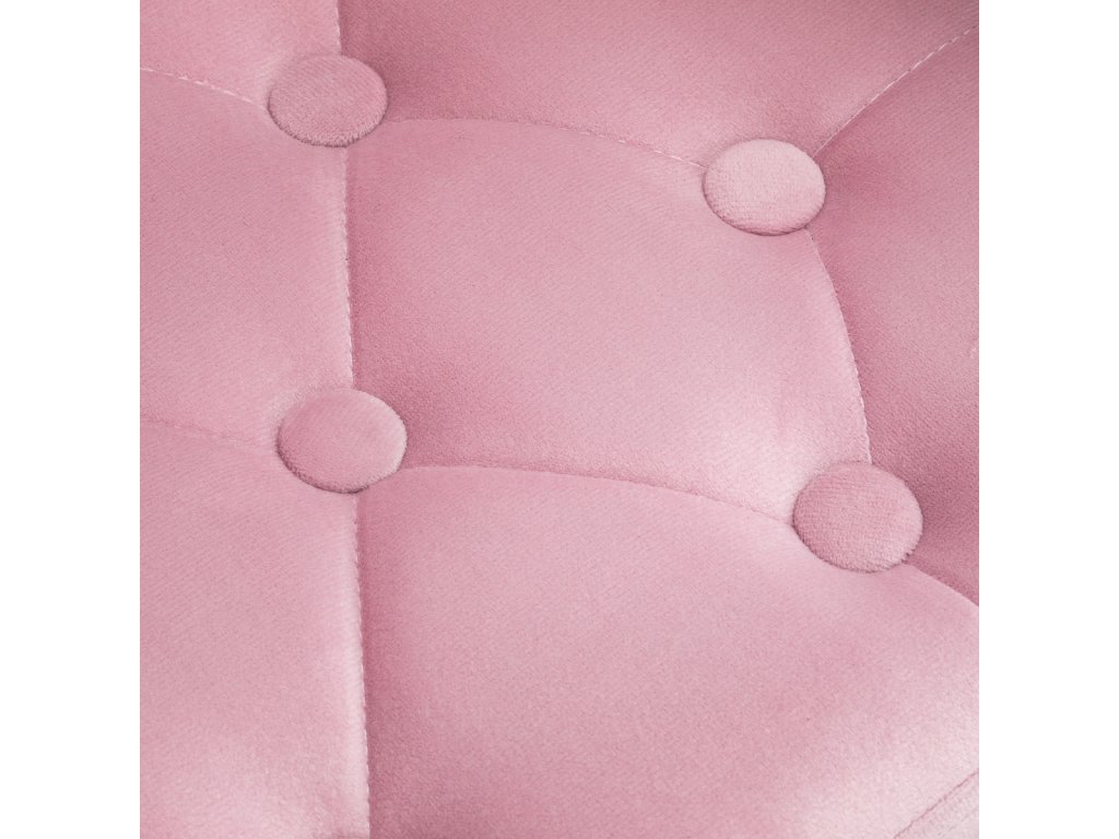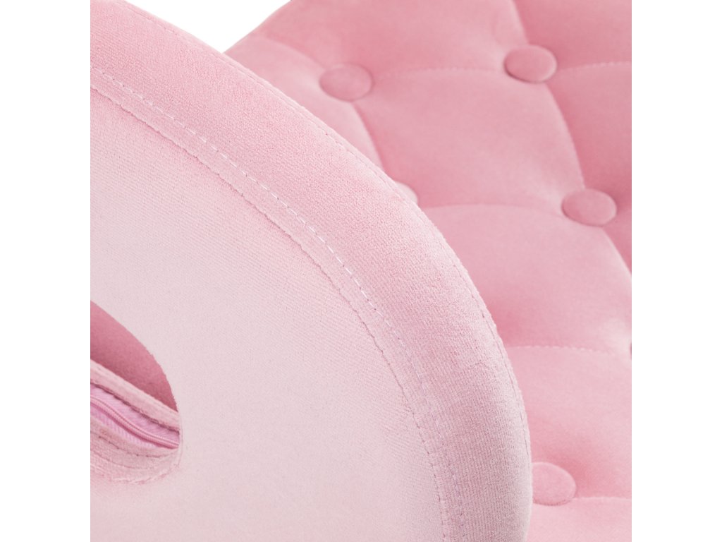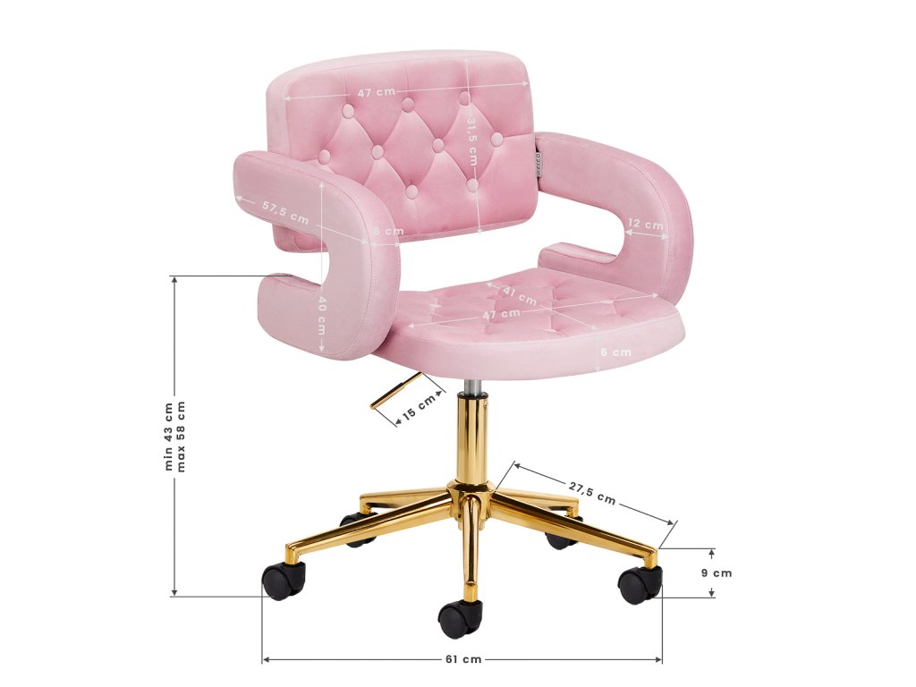 Die weiche Samtpolsterung in Rosatönen verleiht dem Stuhl ein luxuriöses, feminines Flair, das in jedem Kosmetikstudio, Nagelstudio oder Schönheitssalon zum Hingucker wird. Die dekorative Steppung unterstreicht die hohe Verarbeitungsqualität und das edle Design. Der stabile Rahmen in Goldoptik harmoniert perfekt mit der samtigen Oberfläche und verleiht dem Stuhl eine glamouröse Ausstrahlung.