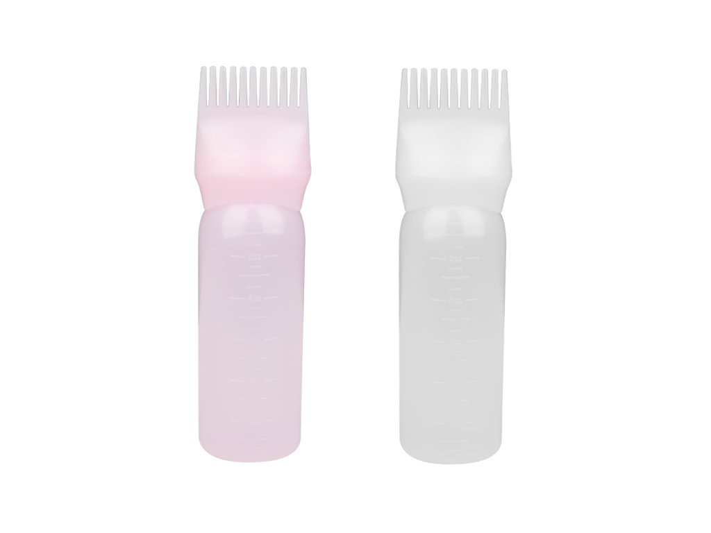 Eine Flasche mit einem Kamm, der die Färbung der Haare erleichtert. Die Arbeit mit der Flasche ist einfach und bequem, ohne unnötige Farbflecken bzw. Verschmutzungen zu verursachen. Füllen Sie einfach die Flasche mit Haarfärbemittel und tragen Sie es mit einem Kamm auf das Haar auf. Die Flasche sollte nach jeder Färbung gründlich gereinigt werden.