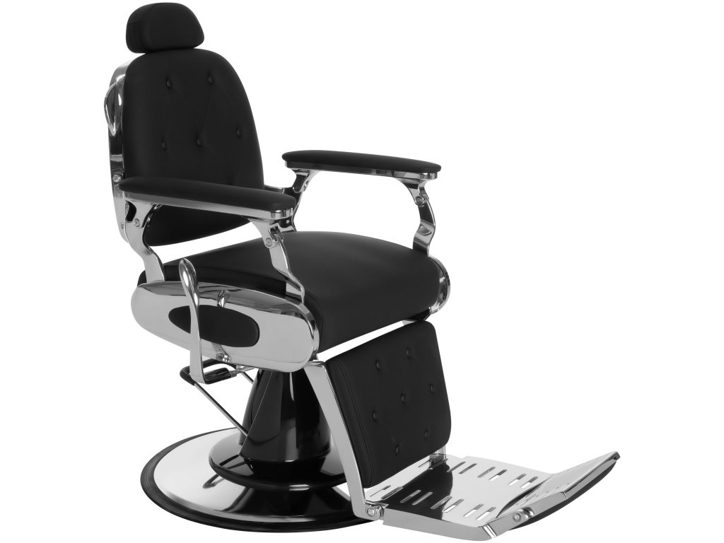 Die dominante schwarze Polsterung mit Knopfsteppung, kombiniert mit verchromten Designelementen, verleiht dem Stuhl ein elegantes, stilvolles Auftreten – ideal für Barbershops, die Wert auf Charakter und Detail legen.