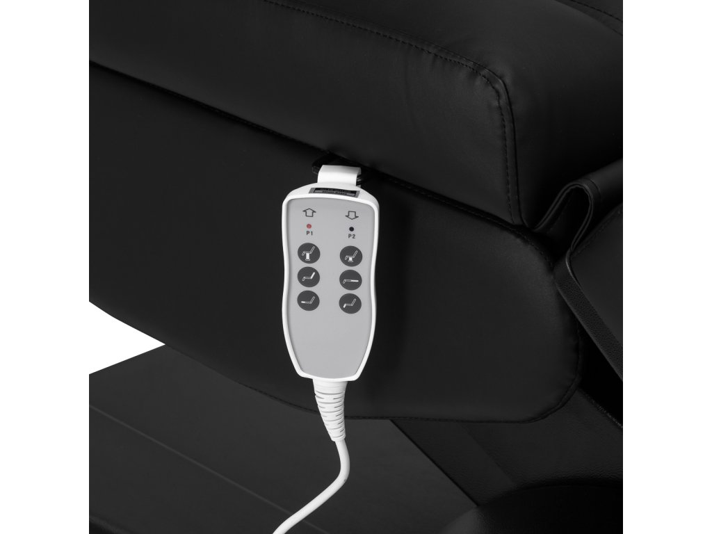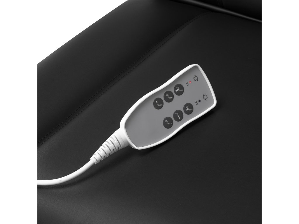 Die bequeme Steuerung mit einer kabelgebundenen Fernbedienung ermöglicht eine präzise Positionierung des Stuhls in vier Ebenen: Höhenverstellung, Rückenlehnenwinkel und Position der Fußstütze. Dieser Einstellbereich ermöglicht es Ihnen, die Position an die Art der durchgeführten Behandlung anzupassen – sowohl im Hinblick auf den Komfort des Kunden als auch auf die Ergonomie der Arbeit des Spezialisten. Zur Vereinfachung der Bedienung kann die Fernbedienung an die Griffe gehängt werden, die sich auf beiden Seiten des Sitzes befinden.