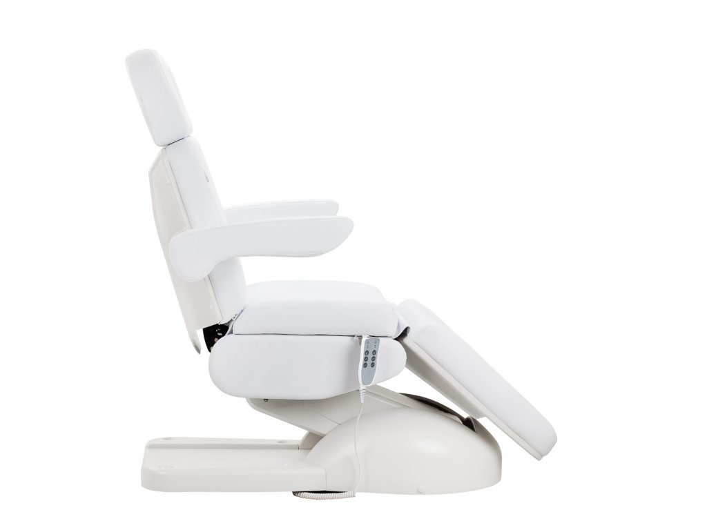 Die bequeme Steuerung mit einer kabelgebundenen Fernbedienung ermöglicht eine präzise Positionierung des Stuhls in vier Ebenen: Höhenverstellung, Rückenlehnenwinkel und Position der Fußstütze. Dieser Einstellbereich ermöglicht es Ihnen, die Position an die Art der durchgeführten Behandlung anzupassen – sowohl im Hinblick auf den Komfort des Kunden als auch auf die Ergonomie der Arbeit des Spezialisten. Zur Vereinfachung der Bedienung kann die Fernbedienung an die Griffe gehängt werden, die sich auf beiden Seiten des Sitzes befinden.
