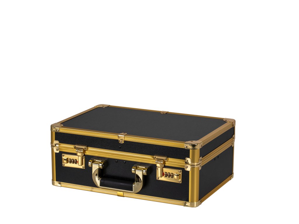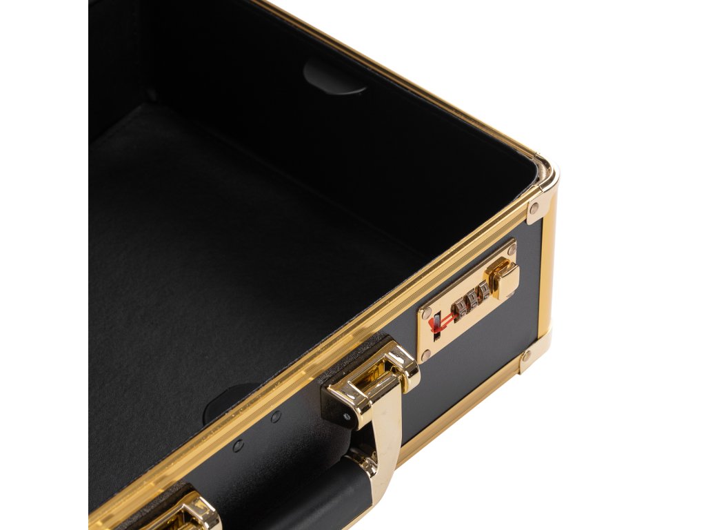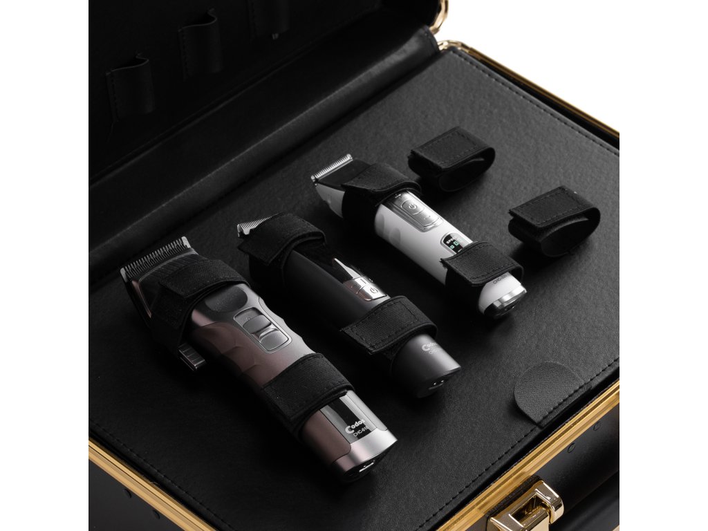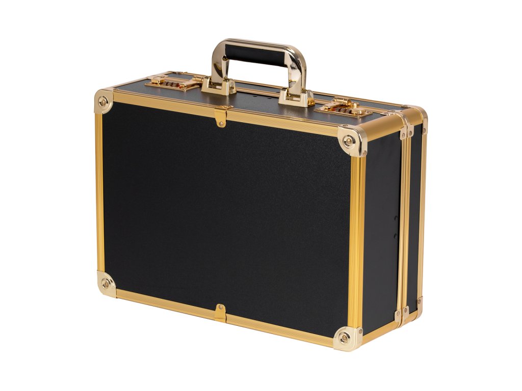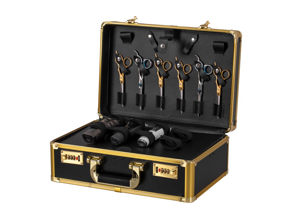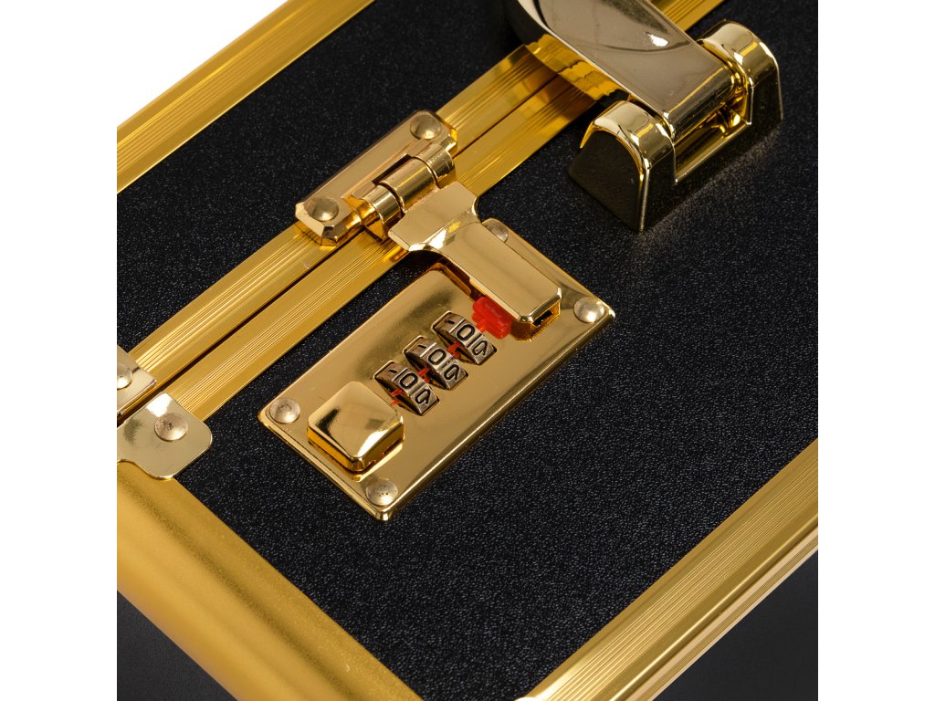 Der Koffer ist aus hochwertigen Materialien gefertigt und zeichnet sich durch eine langfristige Widerstandsfähigkeit gegen Beschädigungen aus. Das moderne Gold- und Schwarz-Finish mit lackierten Elementen verleiht dem Koffer einen einzigartigen, professionellen Look, der mit Sicherheit alle Blicke auf sich ziehen wird. Solide Verarbeitung und Ästhetik machen es zu einem Produkt, das Funktionalität mit Eleganz verbindet. Der bequeme Griff erleichtert das Tragen und ist somit ideal für mobile Friseure und Barbiere.
