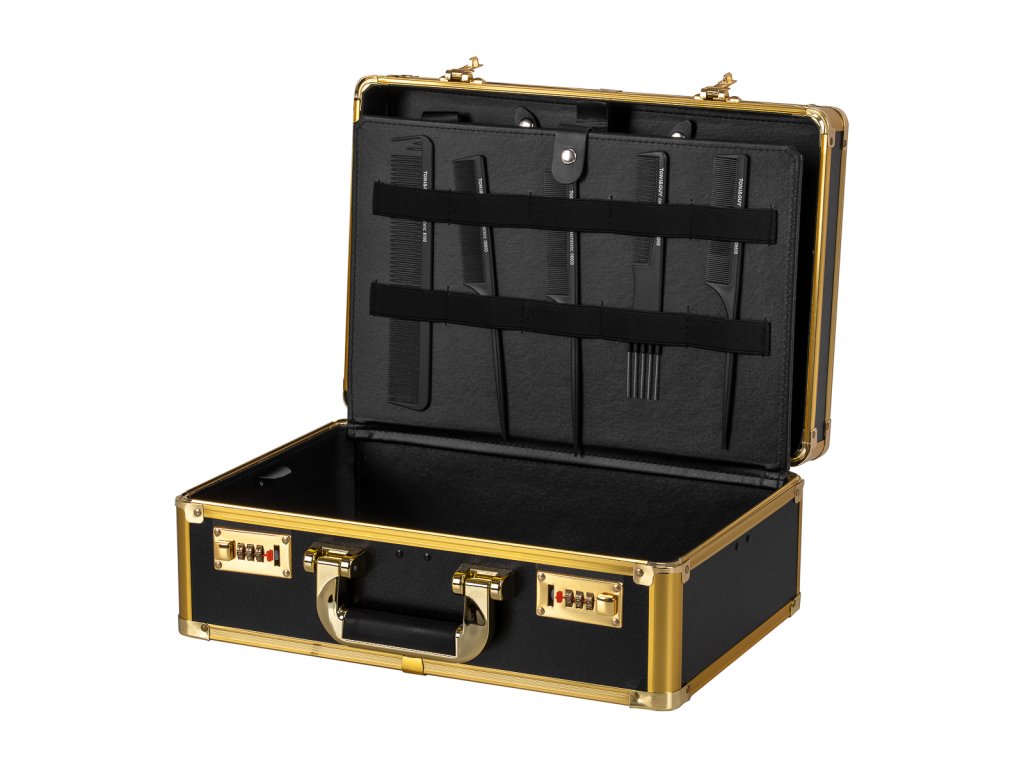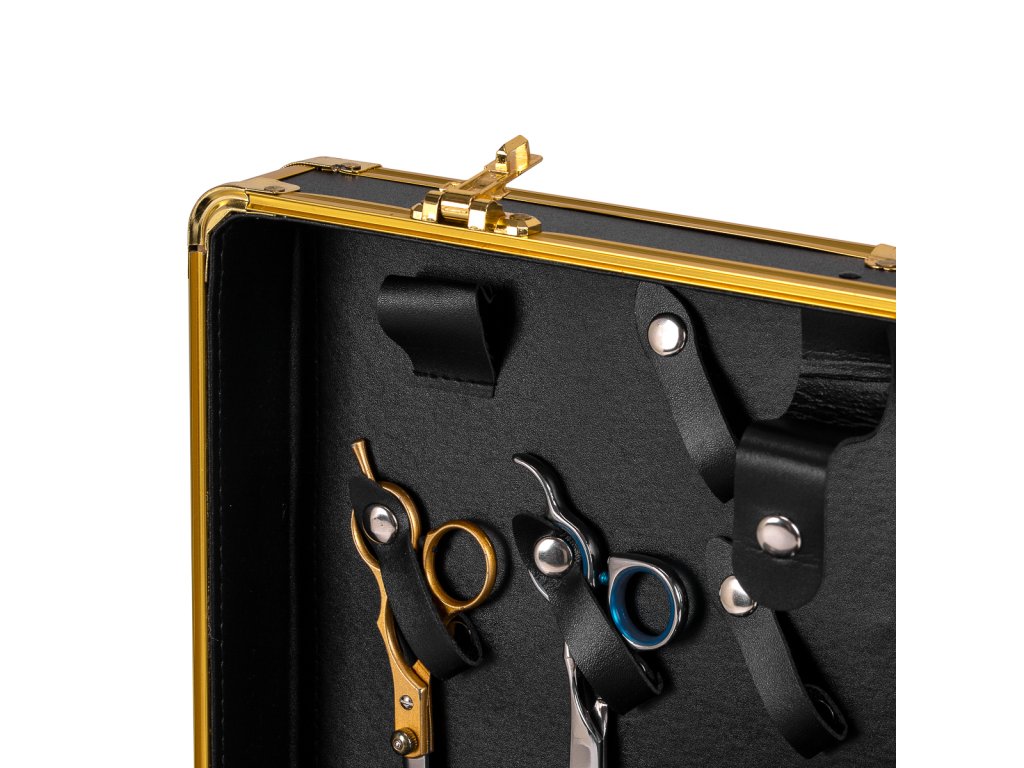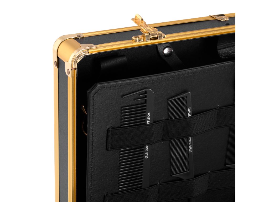 Der Friseurkoffer in elegantem Gold- und Schwarz-Finish ist eine ausgezeichnete Wahl für Profis, die Wert auf Stil und Funktionalität legen. Der Koffer ist auf Komfort und Sicherheit ausgelegt und verfügt über ein geräumiges Fach, das die Organisation Ihrer Werkzeuge erleichtert. Ein speziell entwickelter Abstandshalter mit Gummibändern ermöglicht es Ihnen, Ihre Schere, Bürsten und anderes kleines Zubehör sicher zu verstauen, sodass alles immer leicht zugänglich ist.