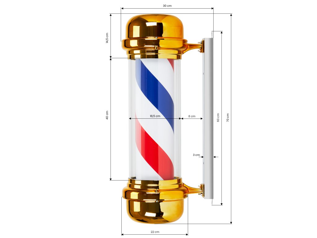 Ein auffälliger beleuchteter Plafond, ausgestattet mit einem rotierenden Zylinder, ist eine hervorragende Werbung für einen Friseursalon. Das markante Design mit rotierenden Elementen in Rot, Weiß und Blau schafft ein einzigartiges, international verstandenes Schaufenster des Friseursalons. Mit Hilfe einer Fernbedienung am Kabel können Sie sowohl die Beleuchtung als auch die Drehung der Deckenleuchte einschalten.