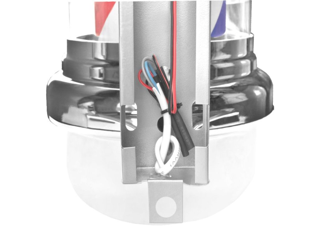 Ein auffälliger beleuchteter Plafond, ausgestattet mit einem rotierenden Zylinder, ist eine hervorragende Werbung für einen Friseursalon. Das markante Design mit rotierenden Elementen in Rot, Weiß und Blau schafft ein einzigartiges, international verstandenes Schaufenster des Friseursalons. Mit Hilfe einer Fernbedienung am Kabel können Sie sowohl die Beleuchtung als auch die Drehung der Deckenleuchte einschalten.