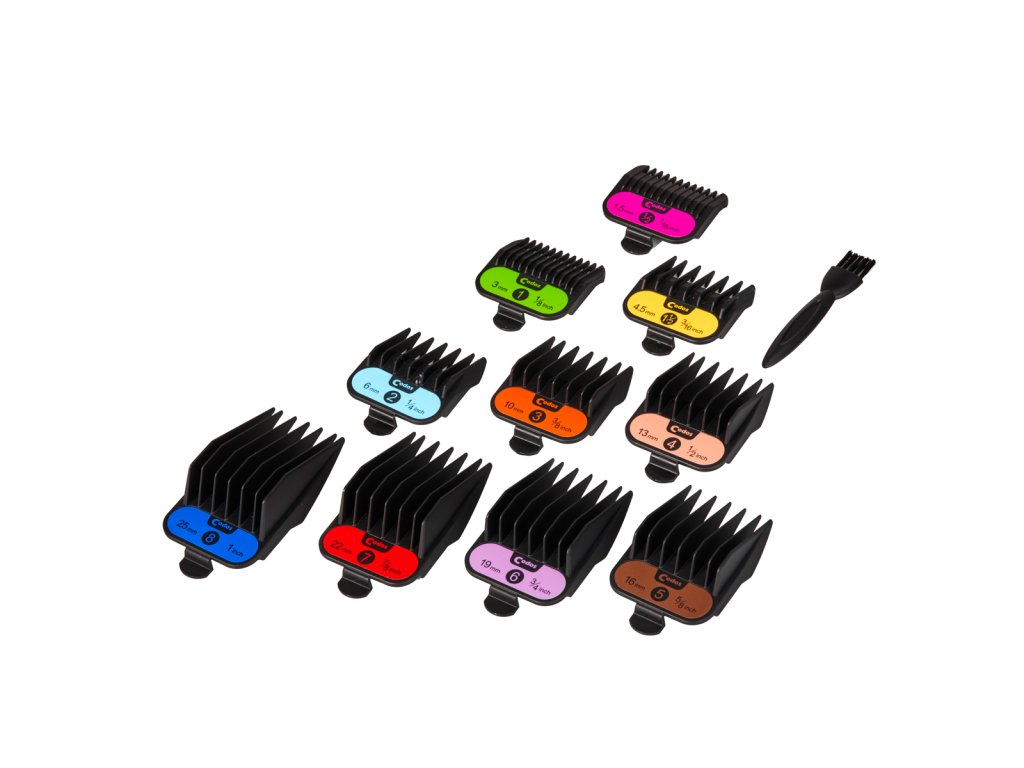 Das Set enthält: einen Rasierer, ein Ladegerät, einen Satz Aufsätze (von 1,5 mm bis 25 mm), eine Reinigungsbürste und eine Flasche Öl für die Wartung.
