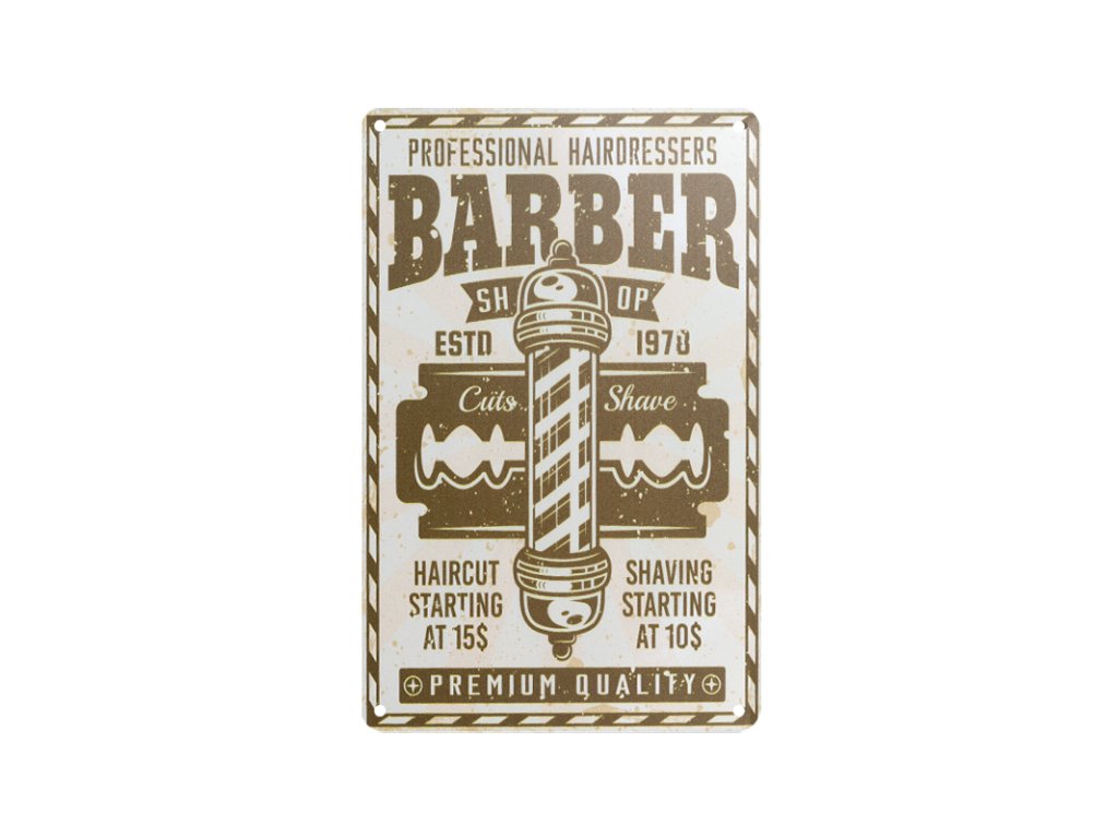 Die Dekorationstafel Barbier B022 ist ein dekoratives Metallschild im Vintage-Stil, das ideal geeignet ist für Tattoo-Studios, Barber Shops, Friseursalons, Kosmetiksalons oder stylische Loft-Wohnungen. Hergestellt aus dünnem, aber robustem Aluminiumblech, überzeugt die Tafel durch ihren hochwertigen Sublimationsdruck, der selbst bei intensiver Sonneneinstrahlung nicht verblasst.