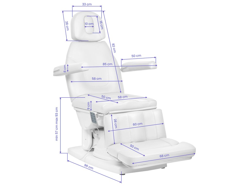 Mit einer Liegefläche von 150 × 80 cm und einer verstellbaren Höhe von bis zu 60 cm eignet sich dieses Modell auch für größere Kunden. Das moderne Design in klassischem Weiß fügt sich harmonisch in jedes Kosmetikstudio oder Fußpflegezentrum ein und betont Professionalität sowie Ästhetik.