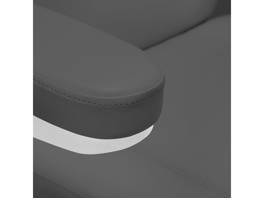Die Polsterung besteht aus pflegeleichtem Kunstleder in edlen Grautönen, das resistent gegenüber Feuchtigkeit und Desinfektionsmitteln ist. Die Polsterung ist mit hochwertigem Schaumstoff gefüllt, der nicht nur hohen Komfort bietet, sondern auch ergonomisch den Körper stützt. Die stabile Basis aus strapazierfähigem Material in Weiß rundet das klare Design ab und verleiht der Liege ein modernes, professionelles Aussehen.