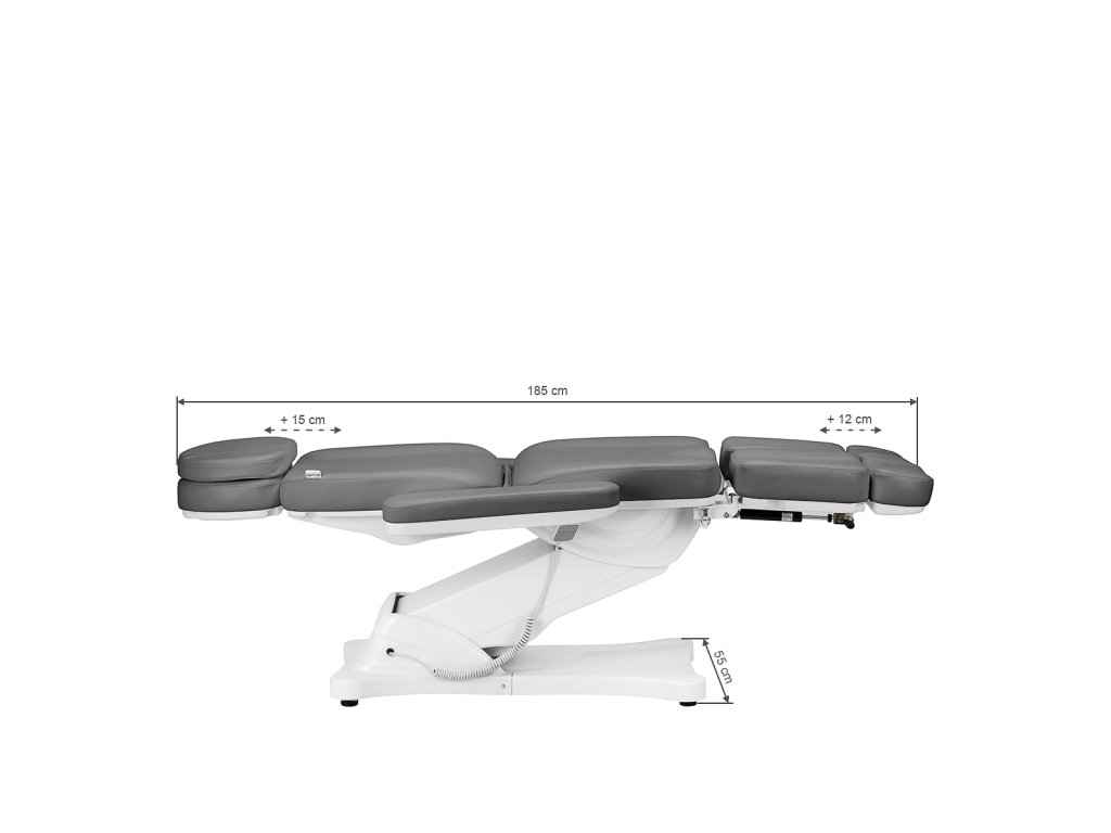 Die Höhe kann von 61 bis 84 cm eingestellt werden, und die maximale Länge beträgt 2 Meter, wodurch auch größere Kund:innen bequem behandelt werden können. Die ausziehbare Kopfstütze mit verdecktem Gesichtsausschnitt ermöglicht Behandlungen in Bauchlage, zum Beispiel Rückenmassagen oder Körperbehandlungen.