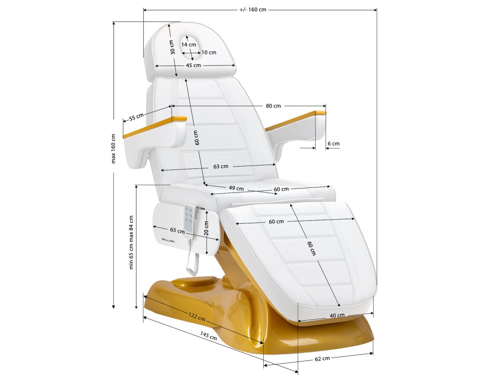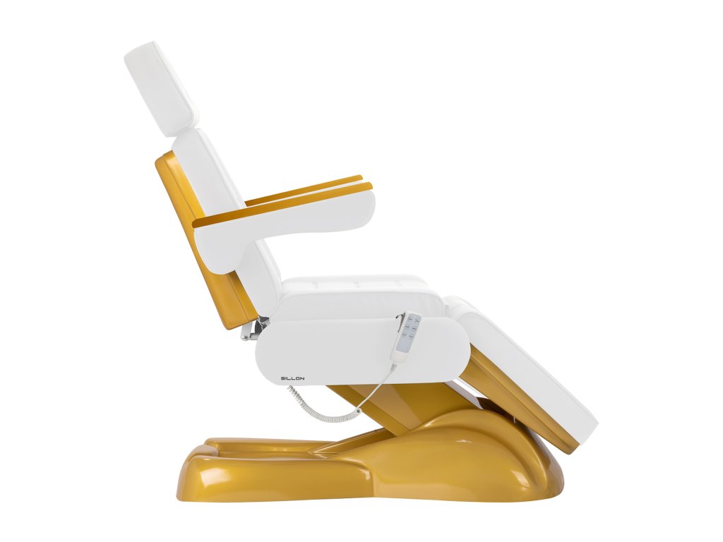 Die elektrische Kosmetikliege SILLON LUX 273B in der edlen Farbkombination Gold-Weiß vereint luxuriöses Design, funktionale Vielseitigkeit und höchsten Anwendungskomfort. Diese professionelle Behandlungsliege ist die perfekte Wahl für moderne Kosmetikstudios, Beauty-Institute, Tattoo-Studios oder Physiotherapiepraxen.