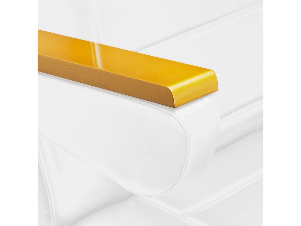 Der ergonomische Sitz mit hochwertigem Schaumstoffkern ist mit einem pflegeleichten Kunstlederbezug in Weiß versehen – widerstandsfähig gegen Feuchtigkeit und leicht zu reinigen. Die stabile Basis in Goldoptik verleiht der Liege nicht nur Standfestigkeit, sondern auch einen eleganten, modernen Look. Stilvolle Holzelemente und akzentuierte Nähte runden das edle Erscheinungsbild ab.