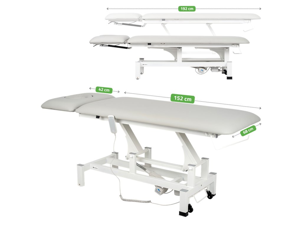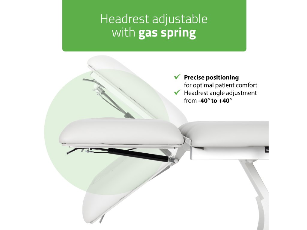 Dank des leisen Elektromotors mit Handbedienung und Sicherheitsstopp lässt sich die Höhe der Liege mühelos und präzise im Bereich von 49–86 cm einstellen. Die zweiteilige Konstruktion mit Gasfeder im Kopfteil ermöglicht eine sanfte und genaue Anpassung an die jeweilige Therapieform.