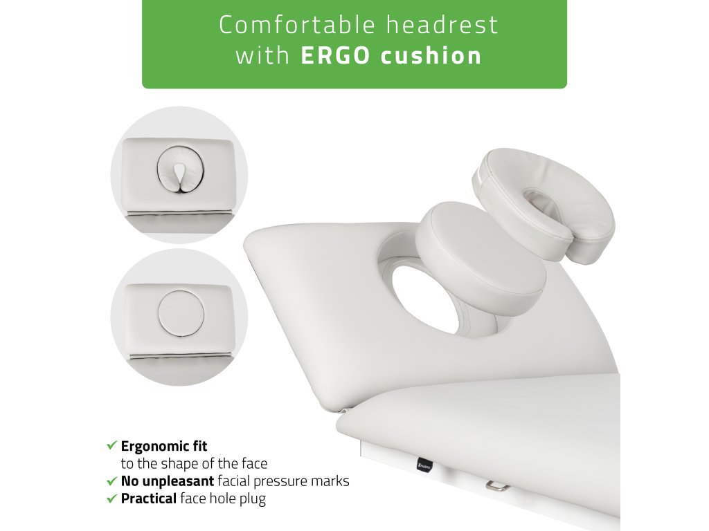 Das speziell geformte Comfort-Kissen mit Gesichtsausschnitt bietet höchsten Komfort auch bei langen Behandlungen. Die 7 cm starke Schaumstoffpolsterung garantiert eine optimale Körperunterstützung. Der Bezug besteht aus hochwertigem Satin Comfort Polstermaterial, das beständig gegen Öle, Schmutz und Desinfektionsmittel ist und sich angenehm anfühlt.