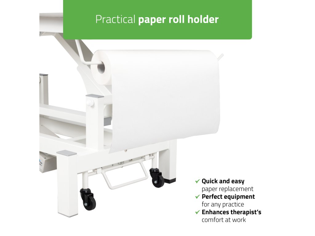 Die robuste Stahlkonstruktion mit einer Tragfähigkeit von bis zu 200 kg, feststellbare Rollen und der integrierte Halter für Papierrollen machen die Liege zu einer zuverlässigen Lösung für den täglichen professionellen Einsatz.