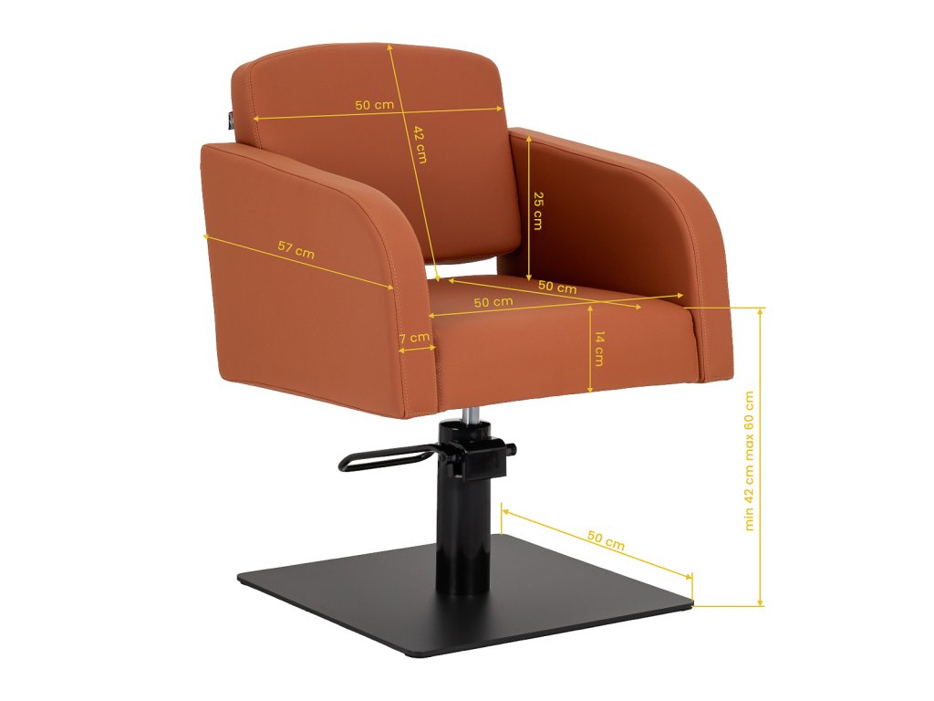 Die hydraulische Pumpe ermöglicht eine stufenlose Höhenverstellung von 42 bis 60 cm – auch während der Kunde bereits im Stuhl sitzt. Ergonomische Rückenlehne, weiches Polster und bequem geformte Armlehnen bieten hohen Komfort auch bei langen Behandlungen.