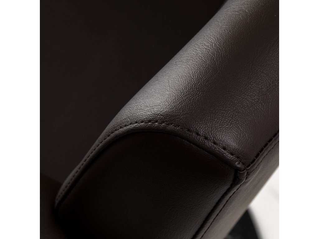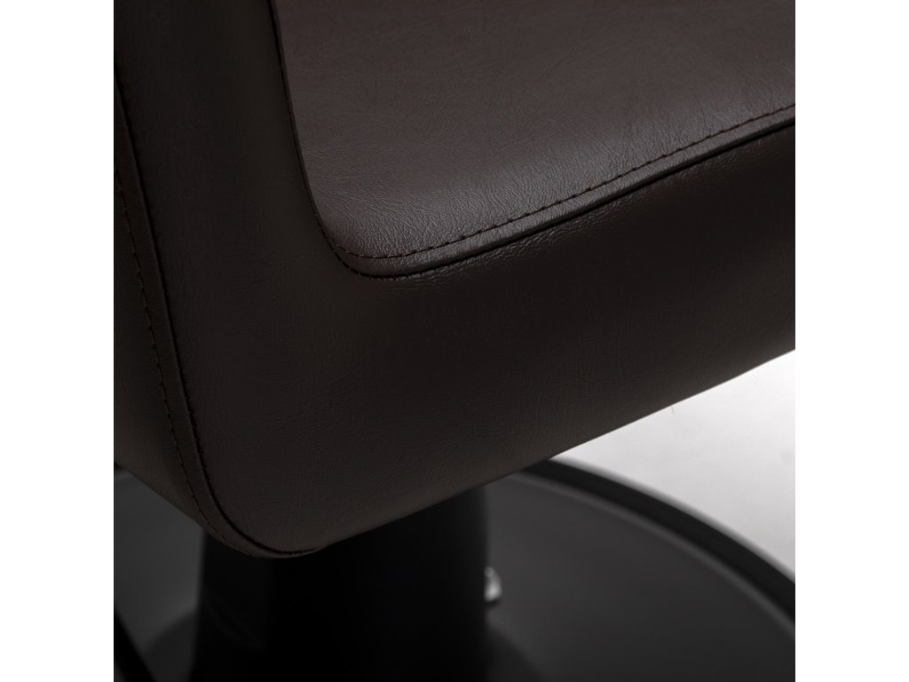 Die runde schwarze Basis sorgt für hohe Stabilität und sicheres Arbeiten auch bei höherer Belastung. Mit einer Tragkraft von bis zu 130 kg ist der Stuhl für ein breites Kundenspektrum geeignet. Der Bezug aus synthetischem Kunstleder in Braun ist angenehm im Griff, feuchtigkeitsresistent und besonders pflegeleicht – ideal für den professionellen Salonalltag.