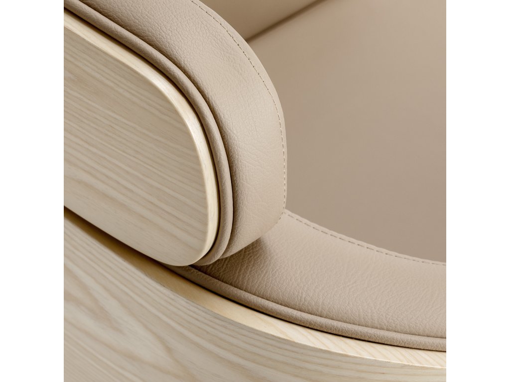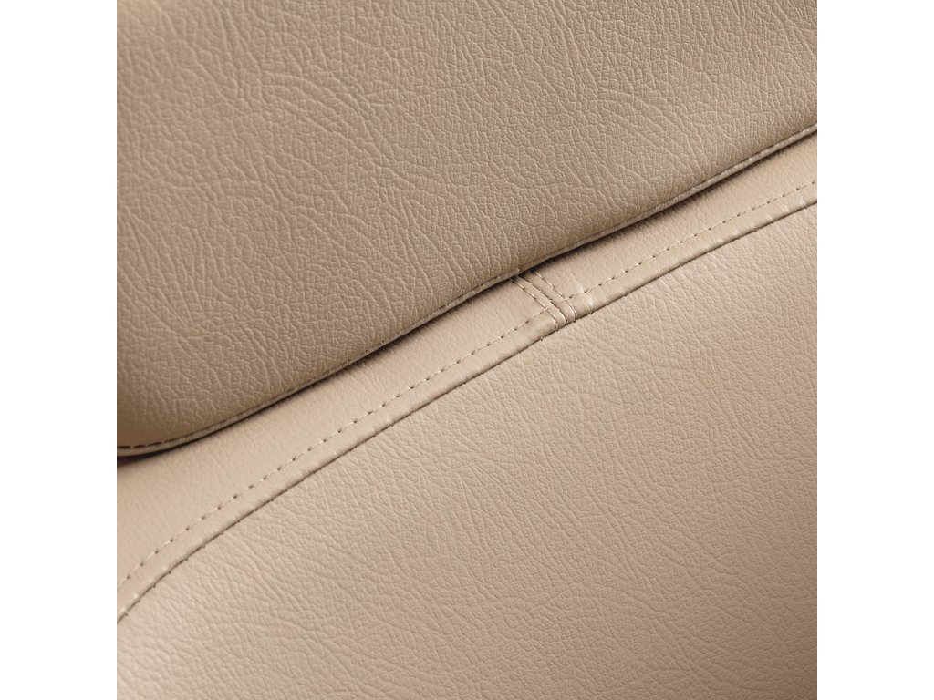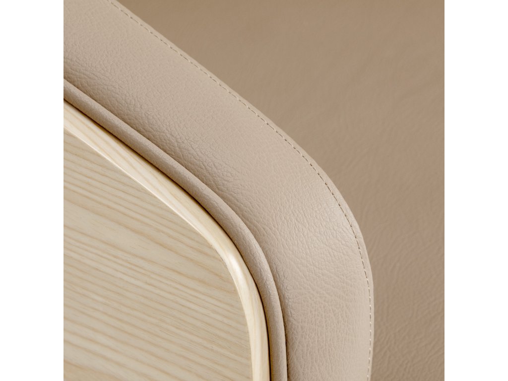 Der Bezug aus hochwertigem Kunstleder in Beige ist pflegeleicht, langlebig und resistent gegen Feuchtigkeit. Die stabile runde Basis in mattem Schwarz sorgt für Standfestigkeit und unterstreicht den modernen Charakter des Stuhls.