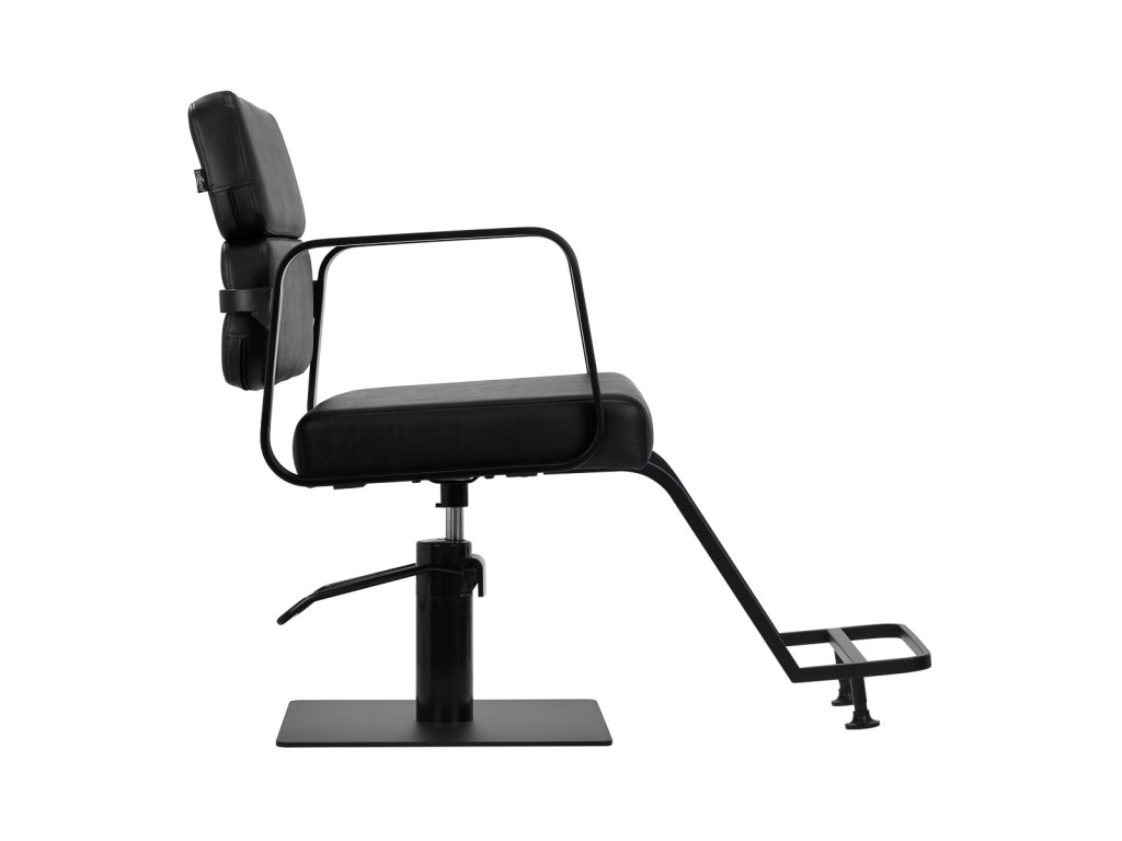 Der mit schwarzem Kunstleder bezogene Stuhl wirkt durch sein minimalistisches Design modern und stilvoll. Die hydraulische Höhenverstellung (49–61 cm) sorgt für maximalen Komfort sowohl für den Kunden als auch für den Friseur – auch während der Behandlung. Die ergonomisch geformte Rückenlehne sowie das praktische offene Rückenteil erleichtern die tägliche Reinigung und tragen zur Ordnung und Hygiene im Salon bei.
