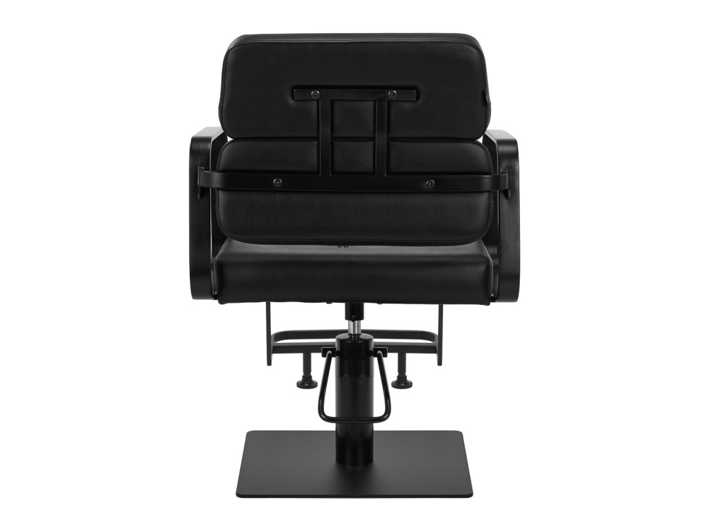 Der quadratische, flache Sockel garantiert Stabilität, während der 360°-Drehmechanismus die Bewegungsfreiheit des Friseurs erhöht. Die gepolsterten Armlehnen aus Metall bieten dem Kunden eine stabile Haltung – perfekt für präzises Schneiden, Färben oder Stylen.
