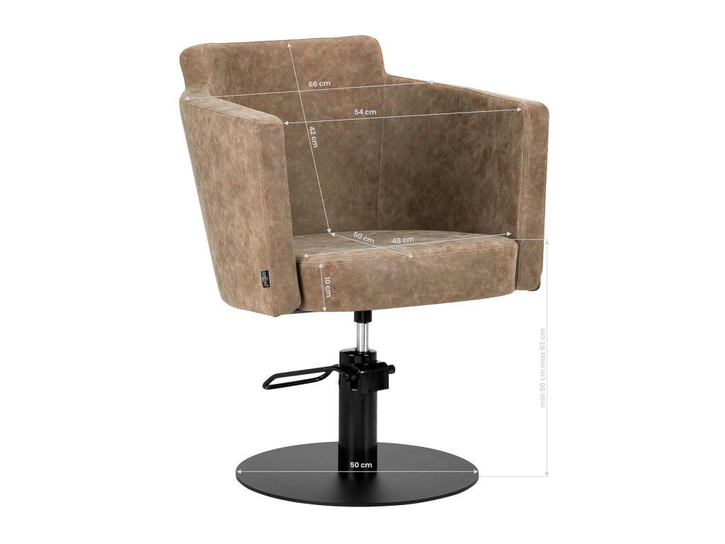 Der langlebige hydraulische Lift ermöglicht eine stufenlose Höhenverstellung zwischen 50 und 63 cm – auch bei belastetem Sitz. So kann die Sitzhöhe optimal an die Körpergröße von Kunde und Friseur angepasst werden, was ein ergonomisches Arbeiten unterstützt.