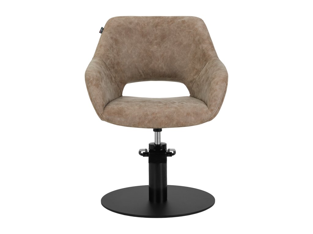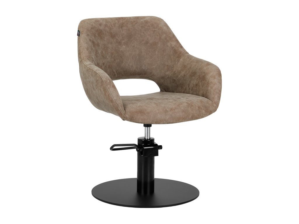 Der massive, runde Standfuß sorgt für Stabilität, während die matte Oberfläche pflegeleicht ist und modern wirkt. Ein 360° Drehmechanismus ermöglicht flexible Bewegungen und effizientes Arbeiten. Die bequemen Armlehnen helfen dabei, die Schultern des Kunden korrekt zu positionieren, was eine entspannte Körperhaltung fördert und die Ausführung präziser Schnitte unterstützt.