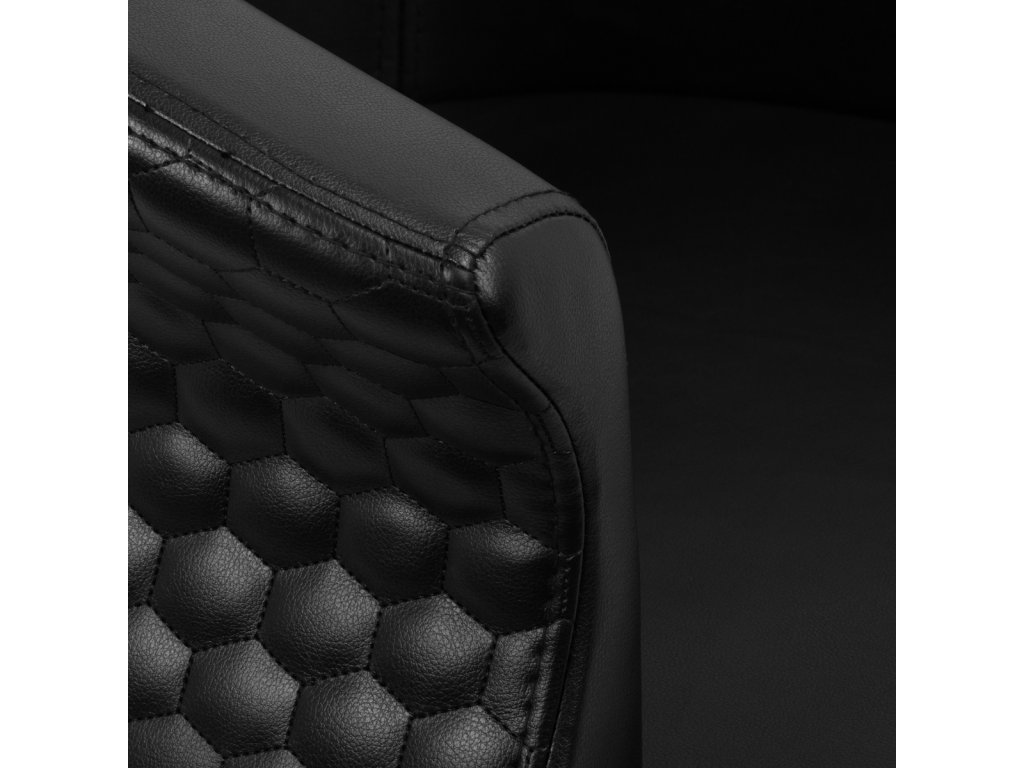 Die Steppung in Fünfeckform verleiht dem Stuhl einen edlen Look, während die lackierten Goldelemente in Kombination mit der schwarzen Polsterung aus hochwertigem Kunstleder ein luxuriöses Gesamtbild schaffen. Der runde, stabile Sockel sorgt für sicheren Halt und einfache Reinigung dank seiner glatten, glänzenden Oberfläche.