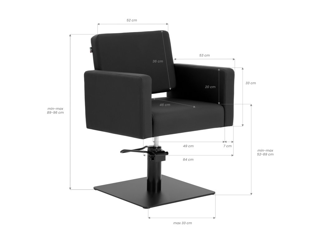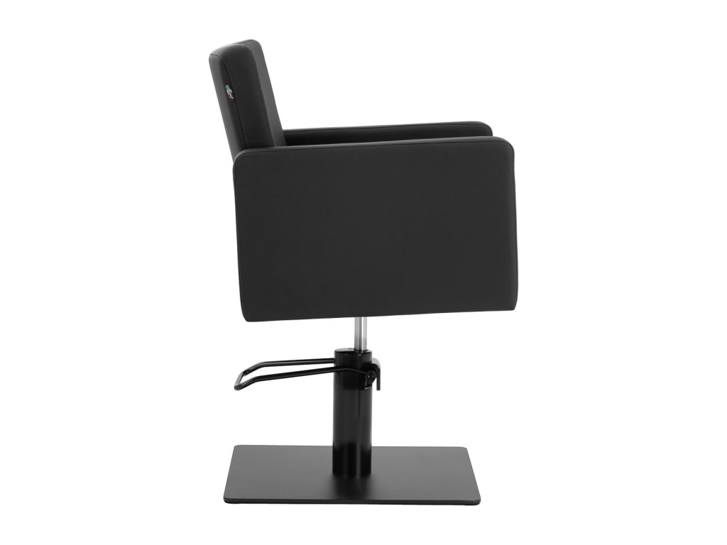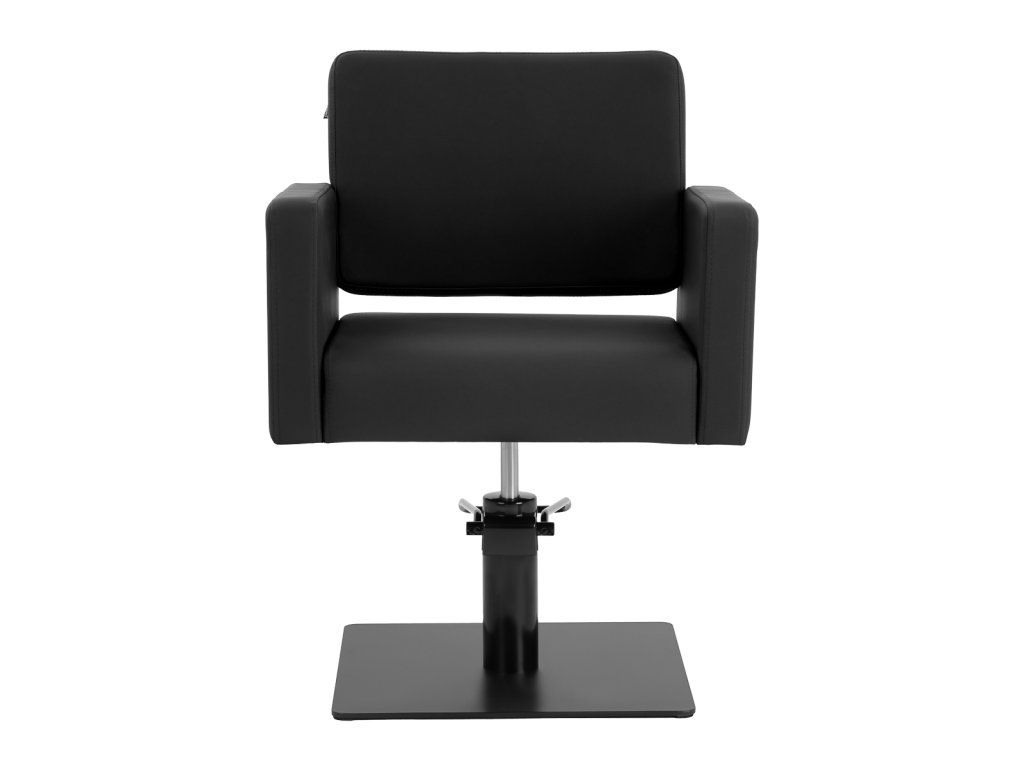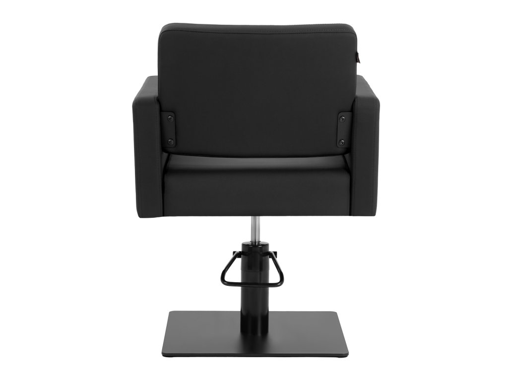 Die stabile quadratische Basis in mattschwarzer Ausführung sorgt für sicheren Stand und hohe Stabilität auch bei höherer Belastung. Mit einer Tragkraft von bis zu 130 kg ist der Stuhl für ein breites Kundenspektrum geeignet. Die Sitzpolsterung aus formstabilem Schaumstoff und der Bezug aus synthetischem Kunstleder in Schwarz sind feuchtigkeitsresistent, pflegeleicht und ideal für den intensiven professionellen Salonbetrieb.