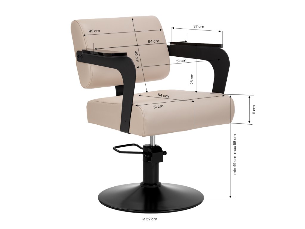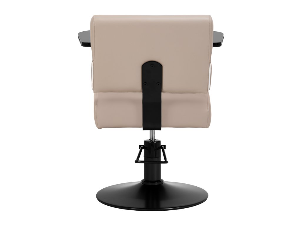 Die stabile runde Basis in schwarzer Ausführung gewährleistet sicheren Stand und Stabilität auch bei höherer Belastung. Mit einer Tragkraft von bis zu 130 kg eignet sich der Stuhl für ein breites Kundenspektrum. Die Polsterung aus formstabilem Schaumstoff sowie der Bezug aus synthetischem Kunstleder in Beigetönen sind feuchtigkeitsresistent, pflegeleicht und für den intensiven professionellen Einsatz im Salon konzipiert.
