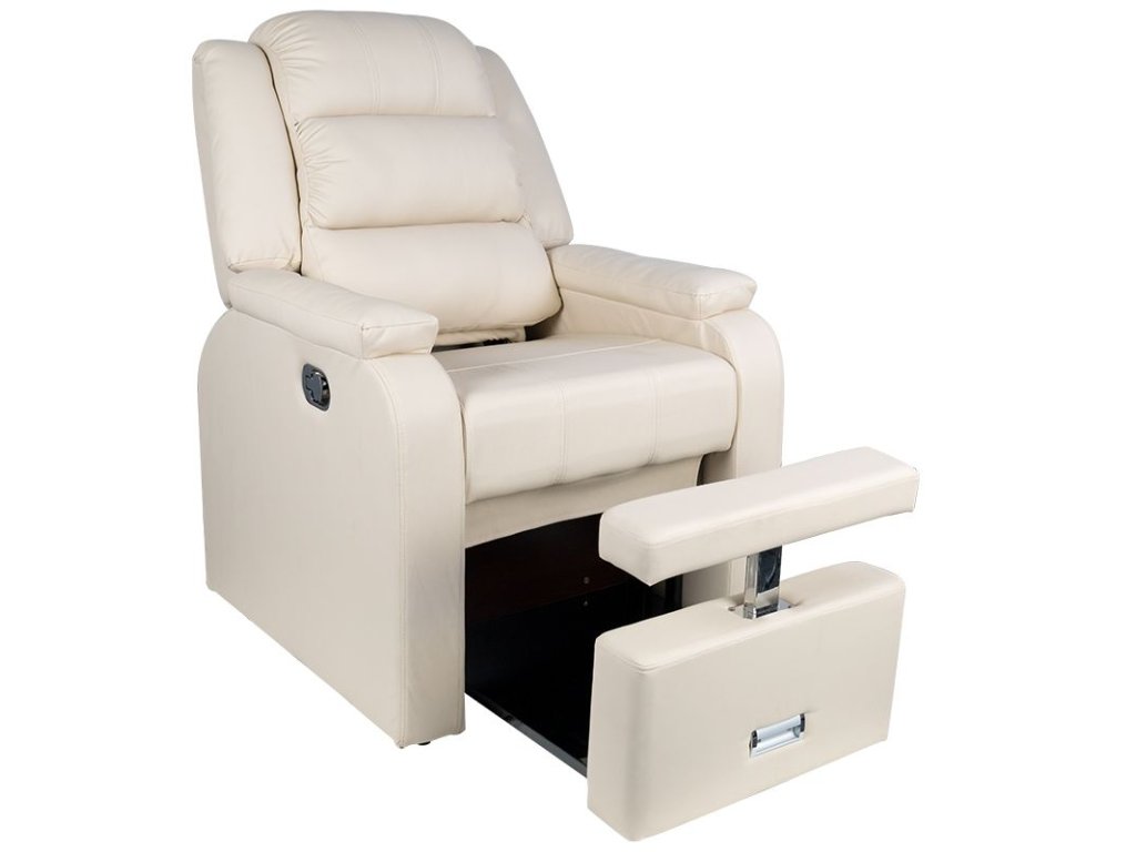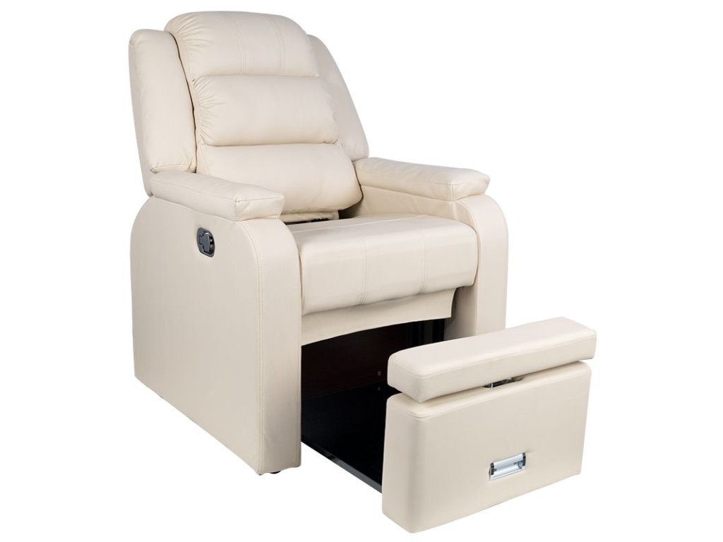 Ein eleganter und sehr bequemer Fußpflegestuhl Hilton ist ein sehr hochwertiger Pedikürstuhl, der mit weichem und haltbarem Öko-Leder gepolstert ist. Der Stuhl ist mit einer Neigungsverstellung der Rückenlehne ausgestattet. Der Sessel ist mit einer "Schublade" ausgestattet, in der Sie eine Pediküre-Schale platzieren können. Um die Durchführung der Pediküre zu erleichtern, verfügt der Stuhl über eine verstellbare Fußstütze. Ein solcher Stuhl ist nicht nur ein stilvolles Möbelstück, sondern auch ein sehr komfortabler Arbeitsplatz.