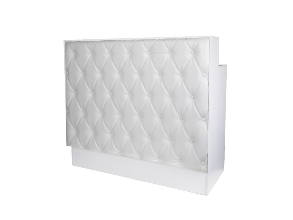 Die Vorderseite der Empfangstheke ist mit einer dekorativen, weiß gesteppten Polsterung versehen, die dem Empfangsbereich Stil, Raffinesse und Exklusivität verleiht. Diese Rezeption hebt sofort das Prestige Ihres Beauty Salons und unterstreicht die Professionalität Ihrer Saloneinrichtung.
