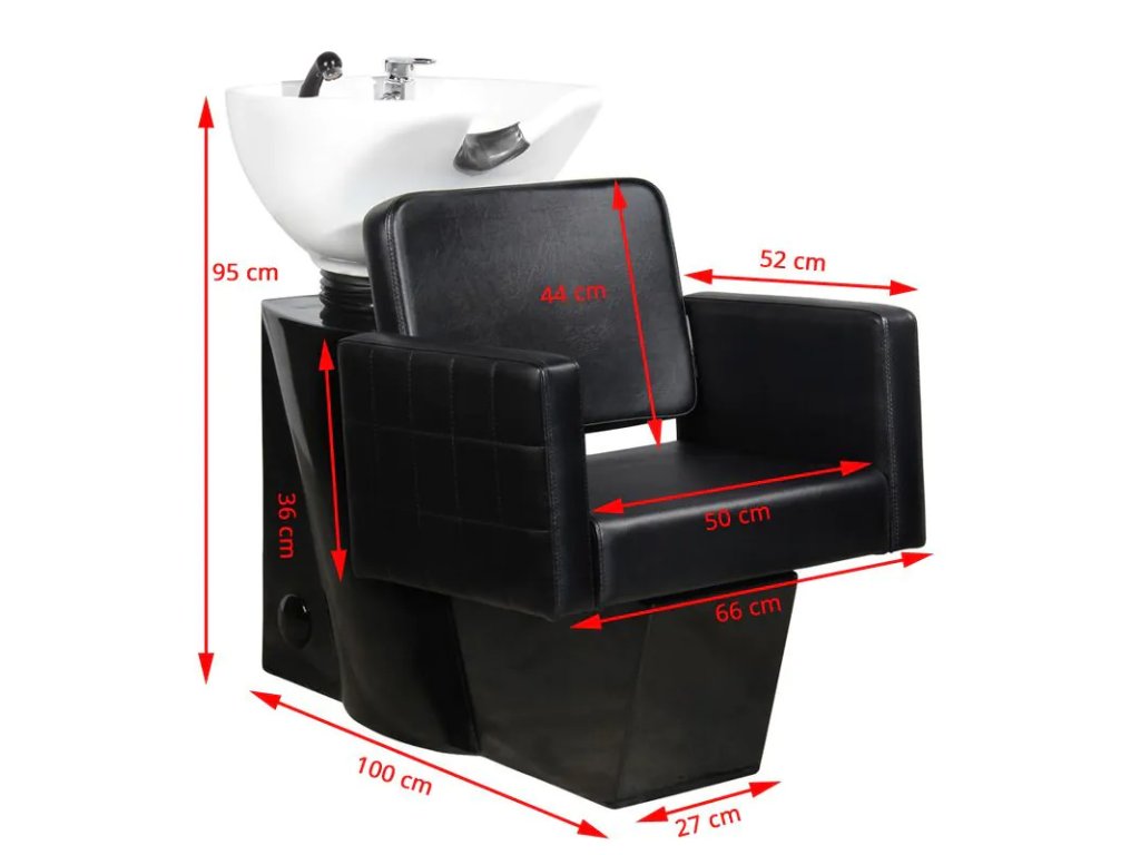Eine professionelle Friseur-Waschanlage - stabil, extrem komfortabel, solide gefertigt. Ein modernes Design macht dieses Möbelstück zu einer schönen Ergänzung der Ausstattung eines modernen Friseursalons. Der Sitz wurde aus hochwertigem Öko-Leder hergestellt, verfügt über interessante Seitennaht. Die Silikon-Kopfstütze stabilisiert den Kopf des Kunden und ermöglicht ein bequemes Legen des Kopfes auf das Waschbecken. Weiße Schale mit einstellbarer Neigung. Die Waschanlage ist in Schwarz erhältlich.Verpackungsabmessungen: 122,5 x 72,5 x 102,5cm