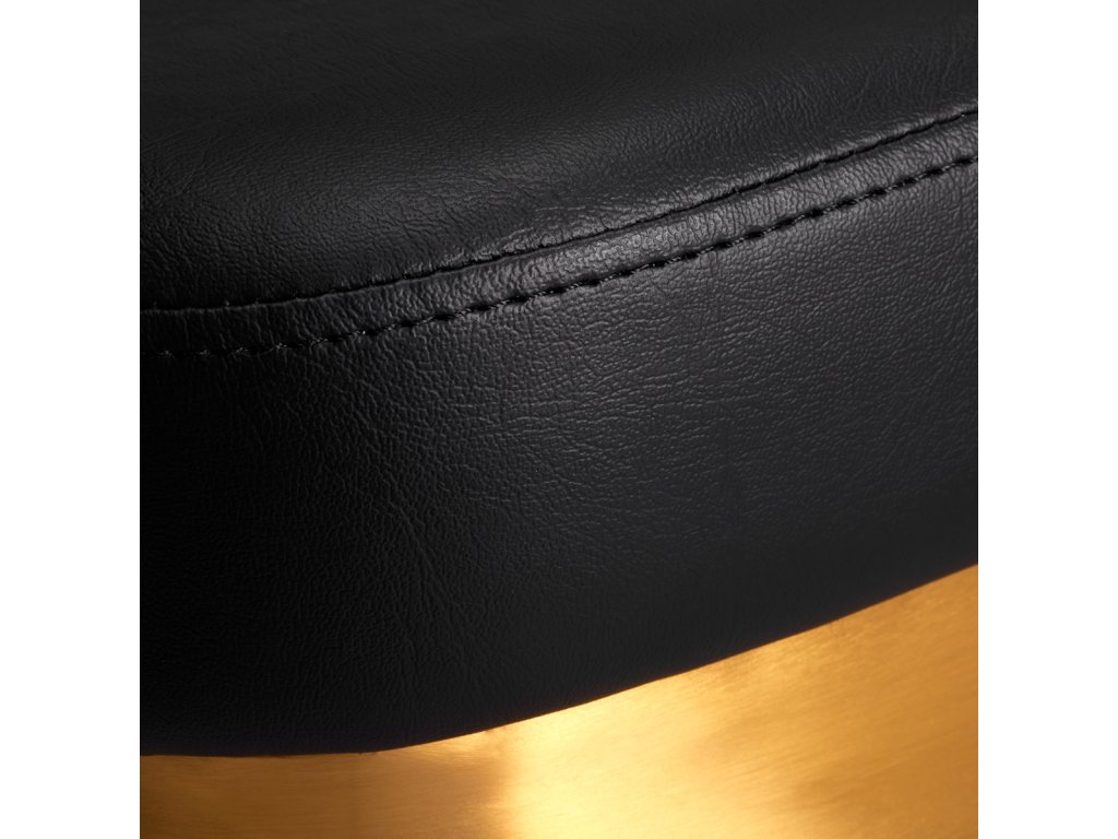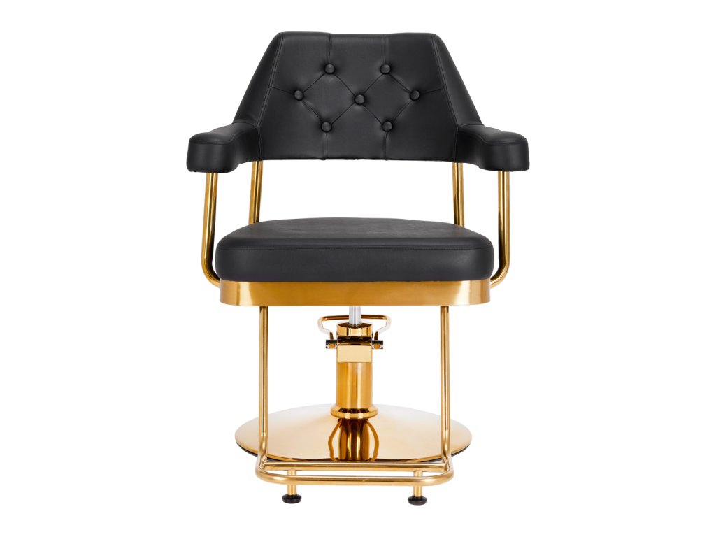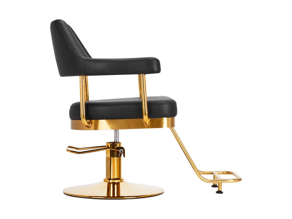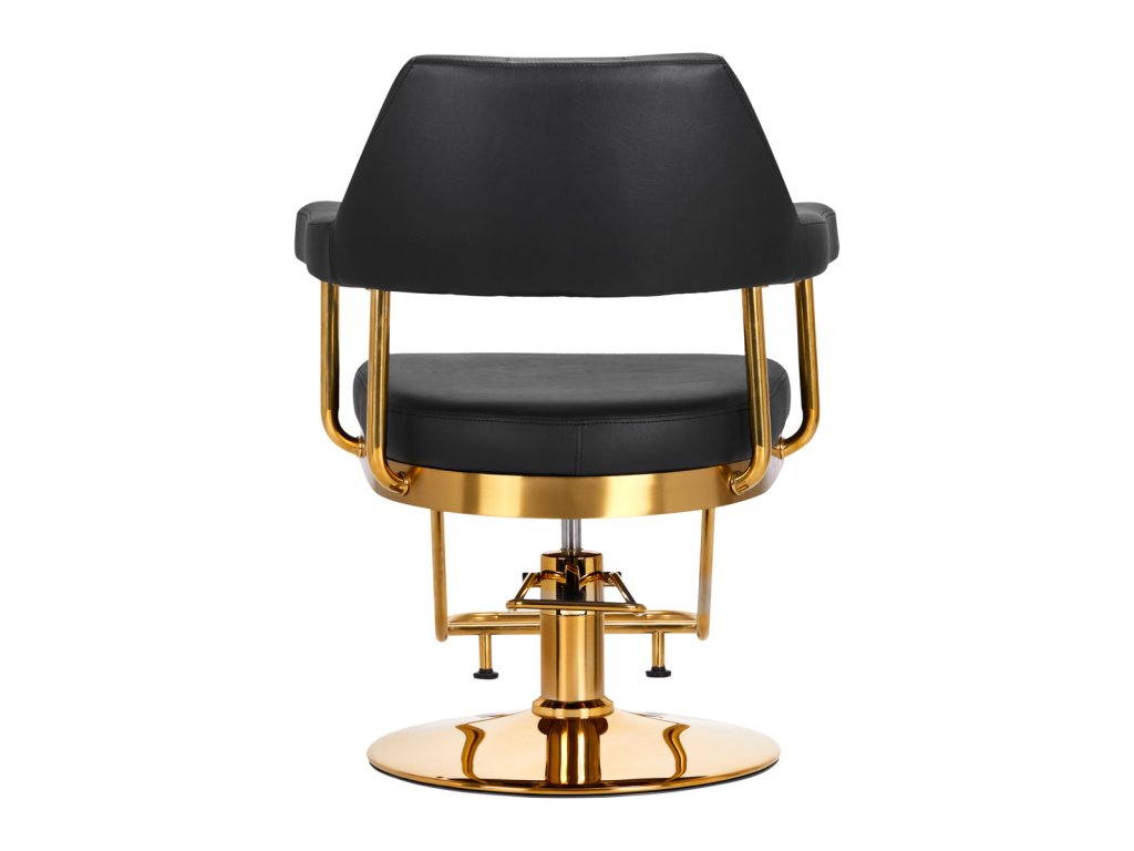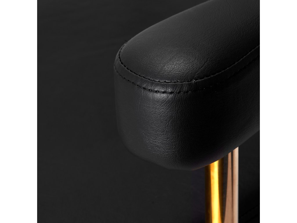 Der Stuhl ist mit Schaumstoff gefüllt, der langlebig ist und sich nicht verformt, was eine bequeme Nutzung für eine lange Zeit gewährleistet. Die Polsterung besteht aus angenehm zu berührendem Lederimitat mit einer spezifischen Struktur. Dank der Verwendung eines solchen Materials ist das Gerät feuchtigkeitsbeständig, langlebig und leicht zu reinigen. Der Bezug in Schwarztönen und dekorative Elemente in Goldfarben verleihen ihm einen Ausdruck zeitloser Eleganz. Es zeichnet sich durch ein geschmackvolles Finish aus, das ihm einen exklusiven Charakter verleiht und es in professionellen Salons gut aussehen lässt.