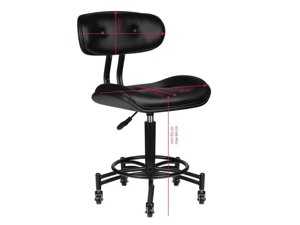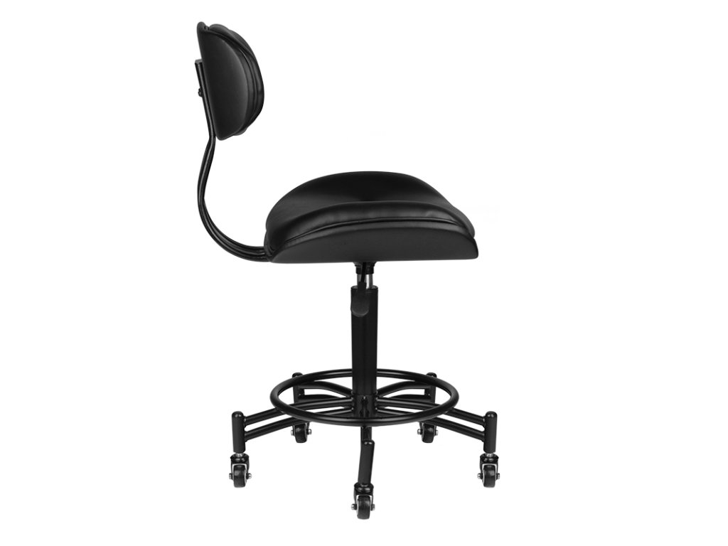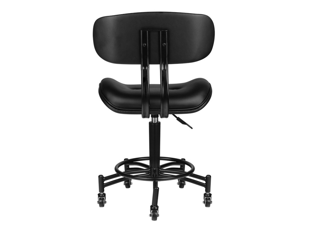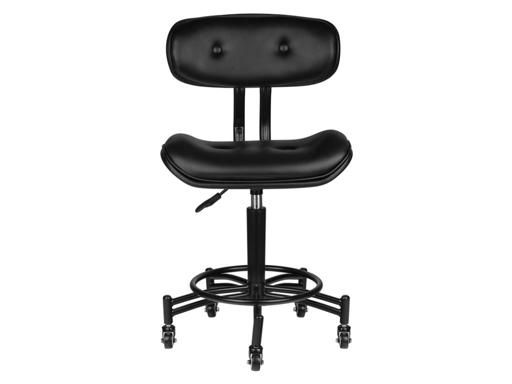 Ein bequemer Hocker aus der Serie Florenz, ideal für Barbershop, Tattoo-Studios und Schönheitssalons. Der Hocker in Schwarz ist mit einem 5-armigen Gestell mit Rollen ausgestattet und mit einem sehr strapazierfähigen, matten Öko-Leder bezogen.