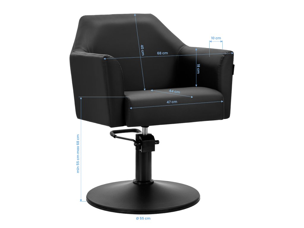 Der gepolsterte Sitz mit Schaumstofffüllung, die ergonomisch geformten Armlehnen sowie der 360° Drehmechanismus sorgen für hohen Komfort und maximale Bewegungsfreiheit beim Schneiden, Färben oder Stylen. Der Stuhl ist zudem mit einem herausziehbaren Sitzbereich ausgestattet, der die Reinigung erleichtert – ein Muss für hygienisch anspruchsvolle Salons.