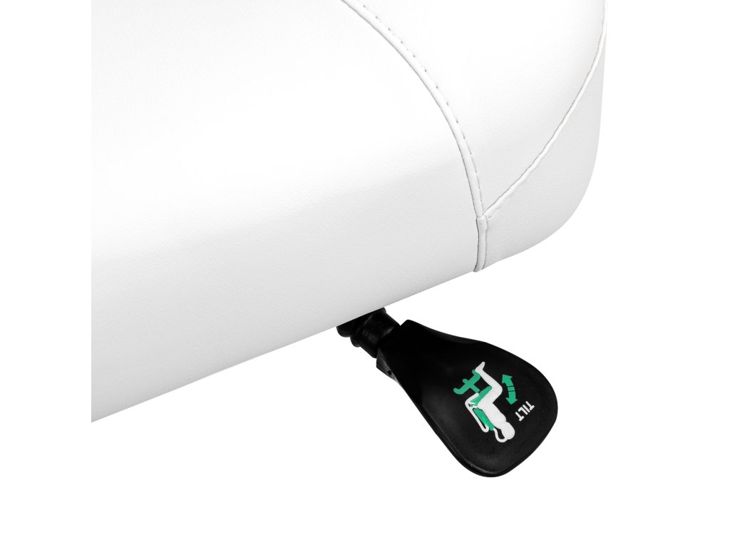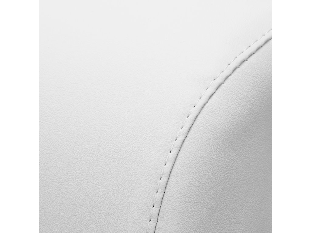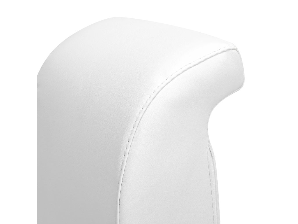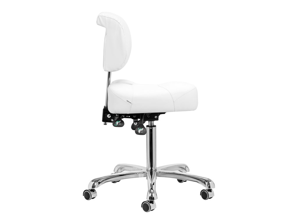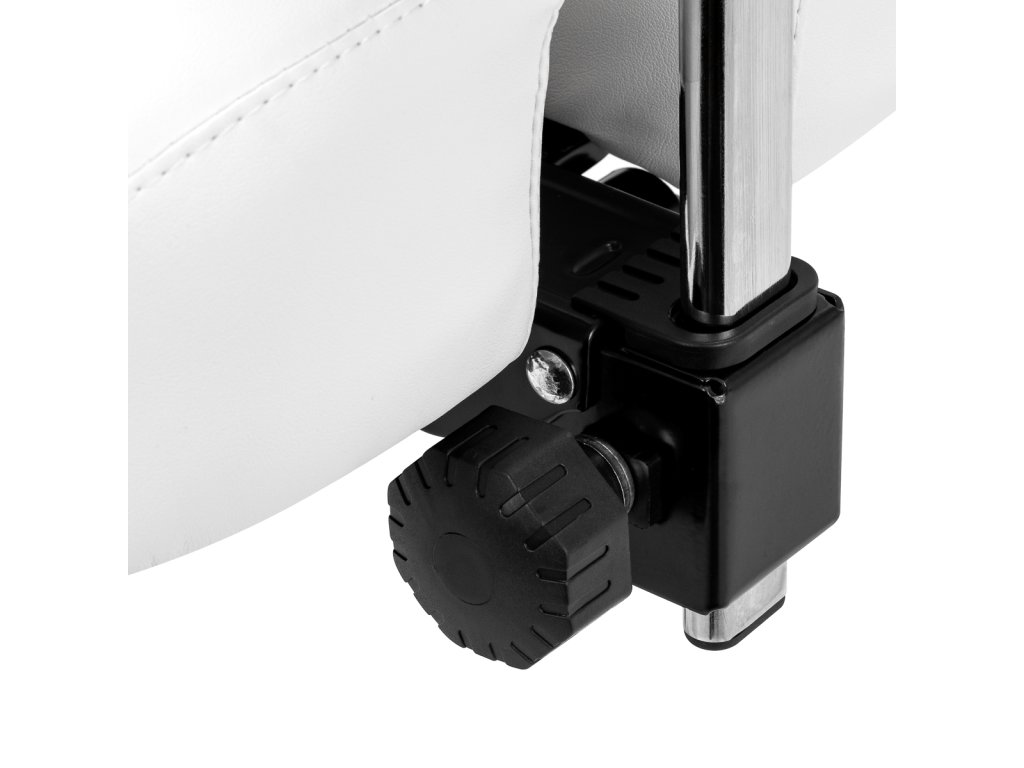 Die fünfarmige Basis sorgt für Stabilität auch bei intensiver Nutzung. Leichtgängige gummierte Rollen ermöglichen eine sanfte Mobilität, ohne den Boden zu beschädigen. Die hochwertige Polsterung aus pflegeleichtem Kunstleder in Weißtönen ist feuchtigkeitsbeständig und hygienisch – ideal für professionelle Anwendungen.