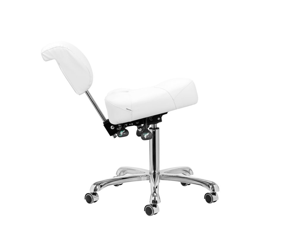 Der mit Gaslift höhenverstellbare Sitz (55–72 cm) lässt sich individuell an die Bedürfnisse der Benutzer anpassen. Die verstellbare Rückenlehne unterstützt optimal die Lendenwirbelsäule und entlastet den Rücken während langer Arbeitseinheiten. Die integrierte Wippfunktion mit Arretierung fördert eine natürliche Körperhaltung und erleichtert ergonomisches Arbeiten bei Kosmetik- und Fußpflegebehandlungen. Durch den 360° Drehmechanismus ist maximale Bewegungsfreiheit garantiert.