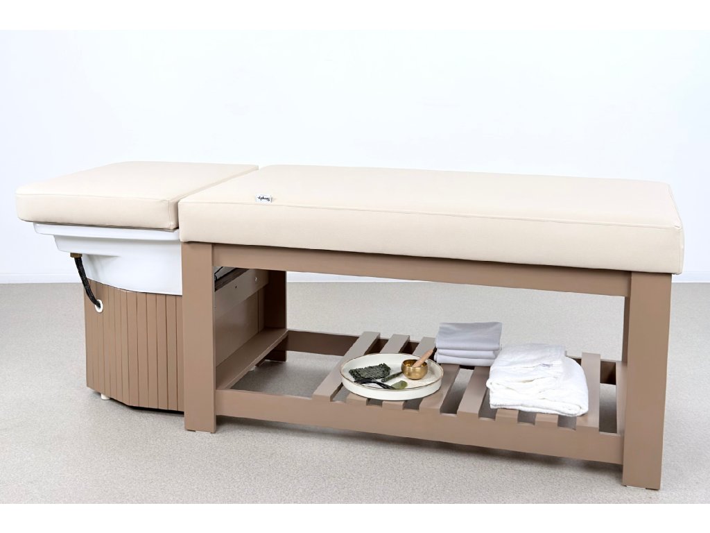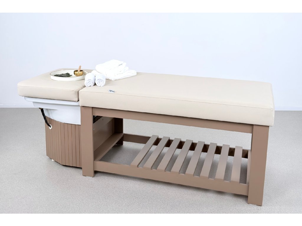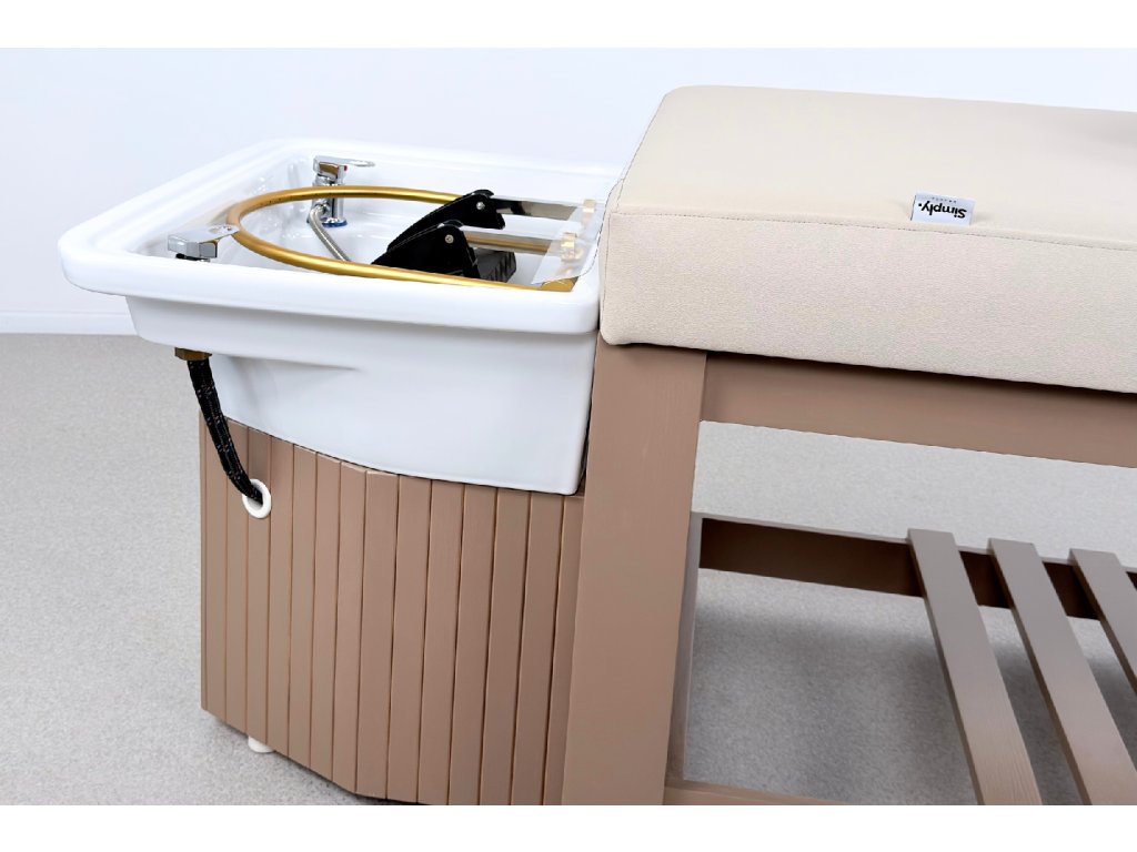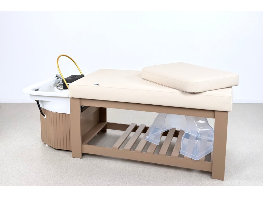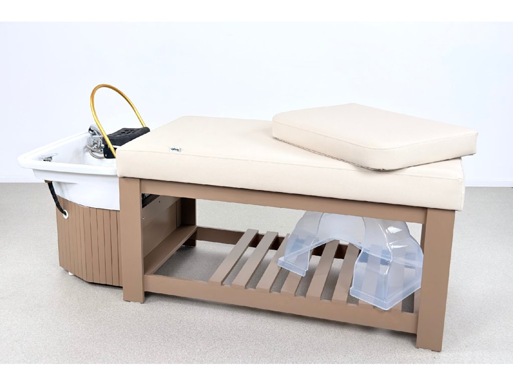 Die Konstruktion besteht aus massivem Holz und steht auf einer stabilen Holzbasis, die maximale Standfestigkeit im täglichen professionellen Einsatz gewährleistet. Bestandteil der Ausstattung ist ein Acryl-Waschbecken mit goldenem Waschringen, das das ruhige, elegante Design der Liege unterstreicht.