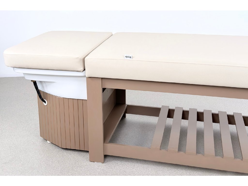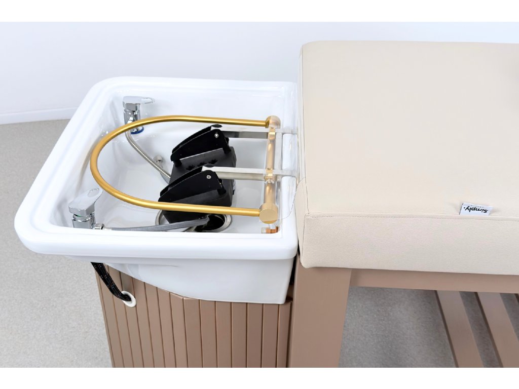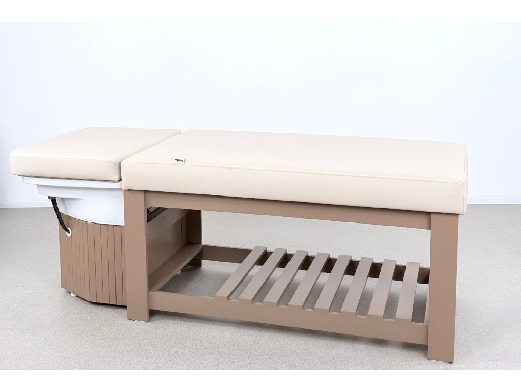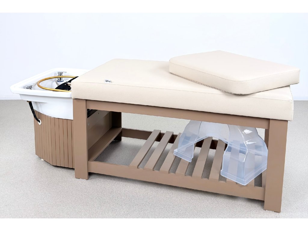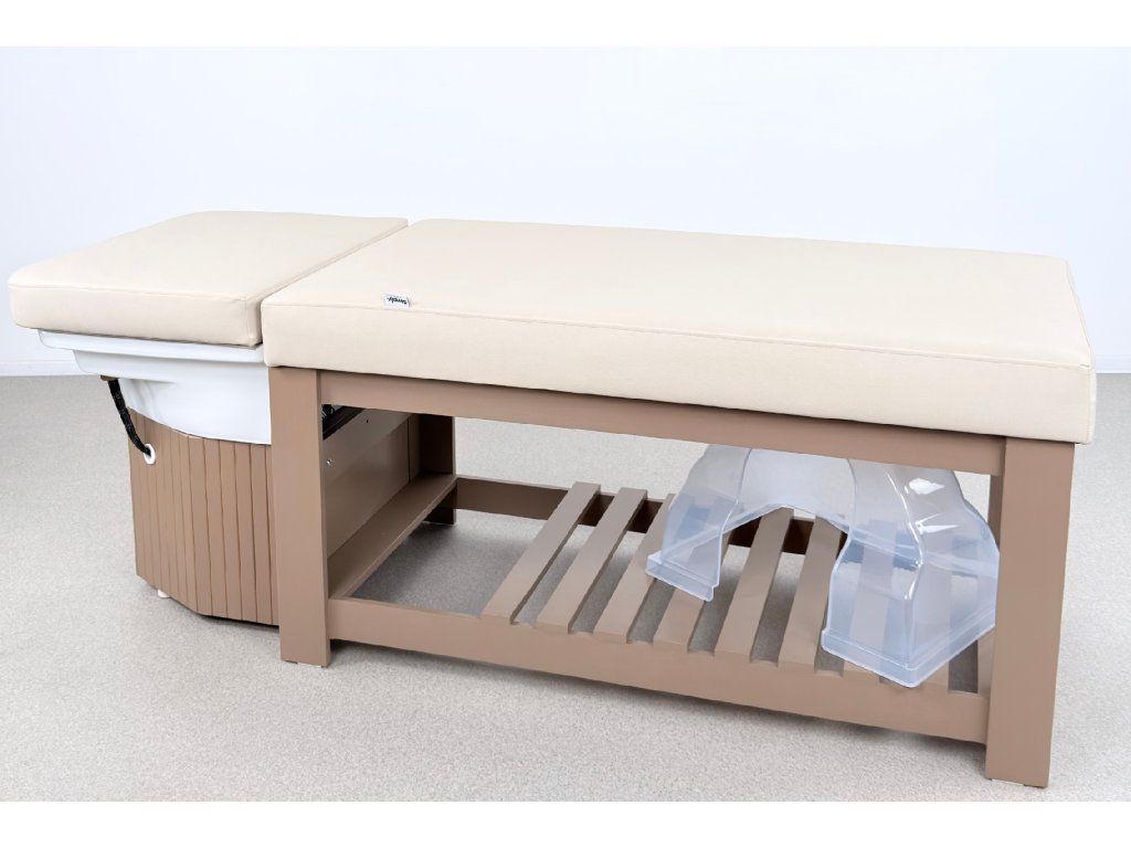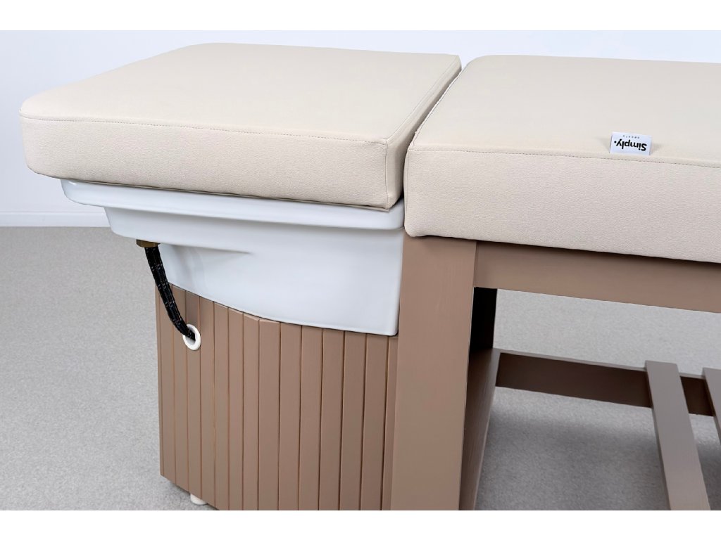Die Konstruktion besteht aus massivem Holz und steht auf einer stabilen Holzbasis, die maximale Standfestigkeit im täglichen professionellen Einsatz gewährleistet. Bestandteil der Ausstattung ist ein Acryl-Waschbecken mit goldenem Waschringen, das das ruhige, elegante Design der Liege unterstreicht.