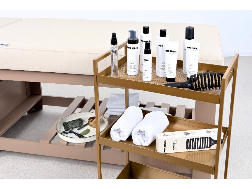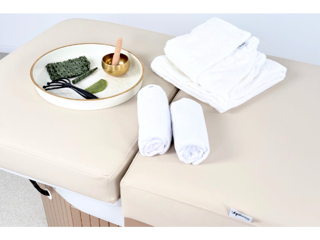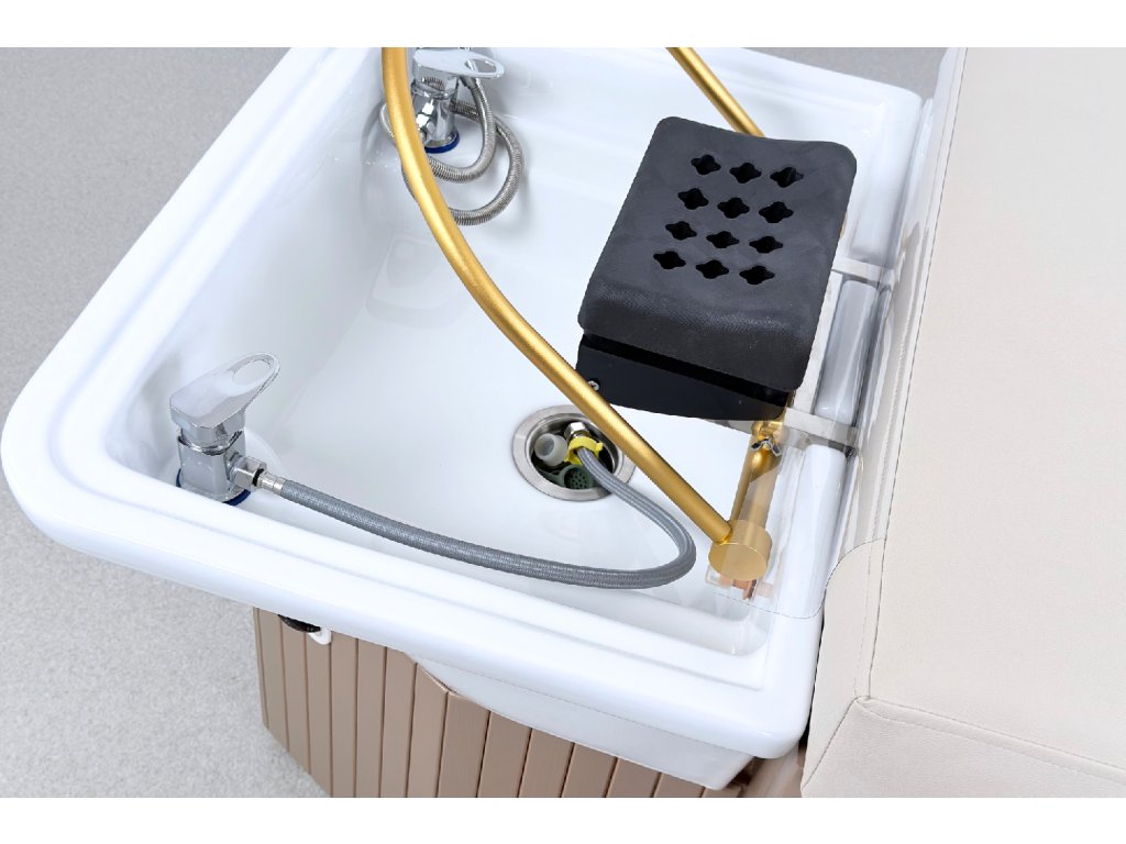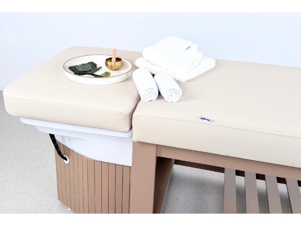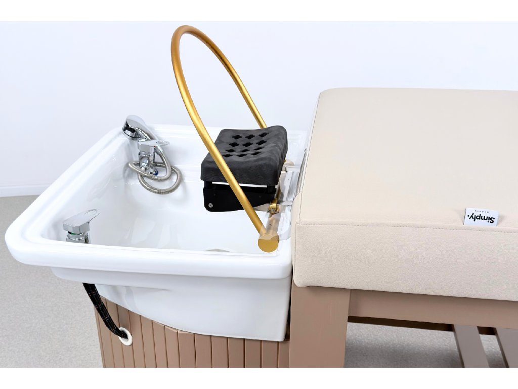 Die Konstruktion besteht aus massivem Holz und steht auf einer stabilen Holzbasis, die maximale Standfestigkeit im täglichen professionellen Einsatz gewährleistet. Bestandteil der Ausstattung ist ein Acryl-Waschbecken mit goldenem Waschringen, das das ruhige, elegante Design der Liege unterstreicht.