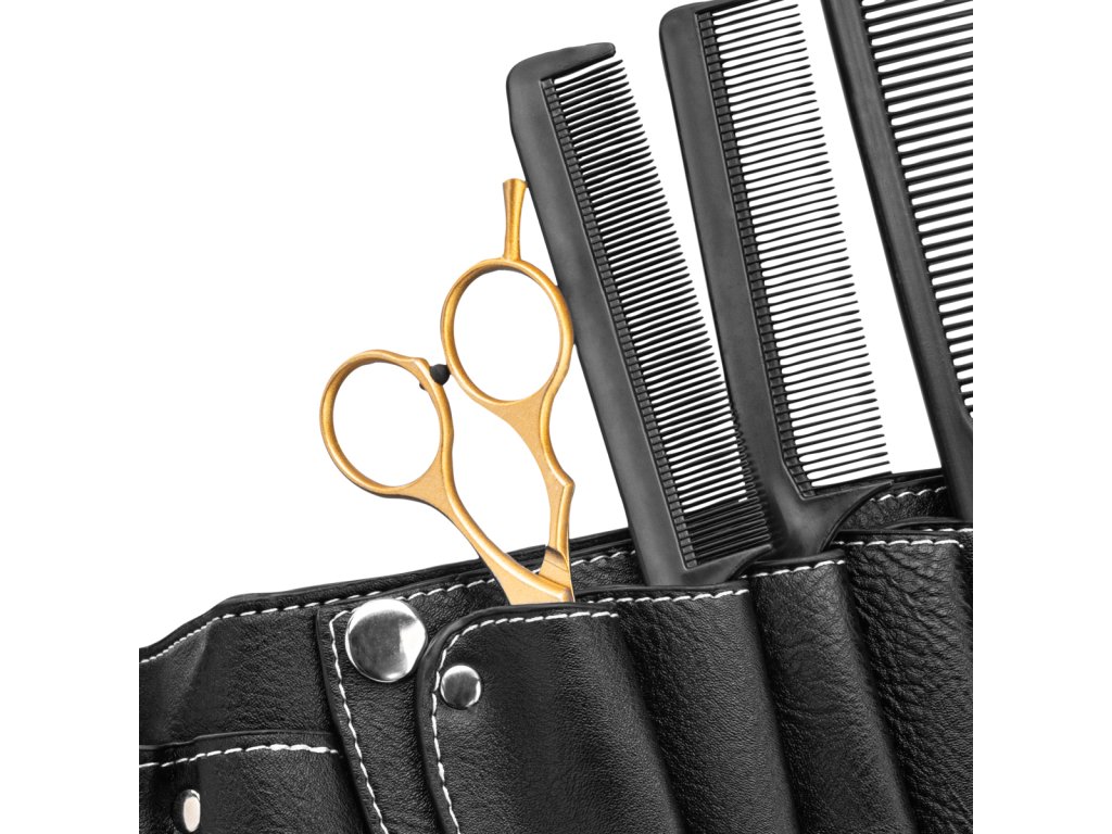 Holster für Friseurzubehör, aus Kunstleder. Es verfügt über viele praktische Taschen und Fächer für das nötige Friseurzubehör. Verstellbar am Riemen, schwarze Farbe.