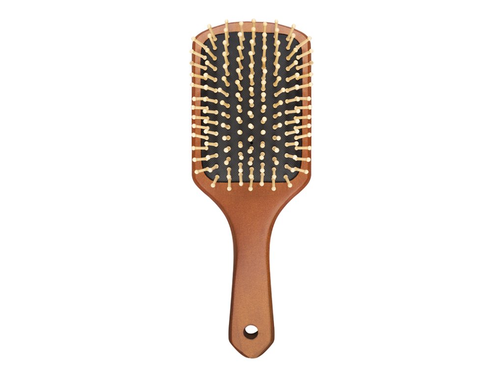 Diese Holz-Haarbürste ist ausgestattet mit Holznadeln, die abgerundete Enden besitzen und auf einem Gummikissen angeordnet sind. Das Gummikissen erlaubt mit seinem Loch ein ordnungsgemäßes Arbeiten der Bürste während des Kämmens. Es besitzt antistatische Eigenschaften – die Haare elektrisieren sich beim Kämmen nicht.