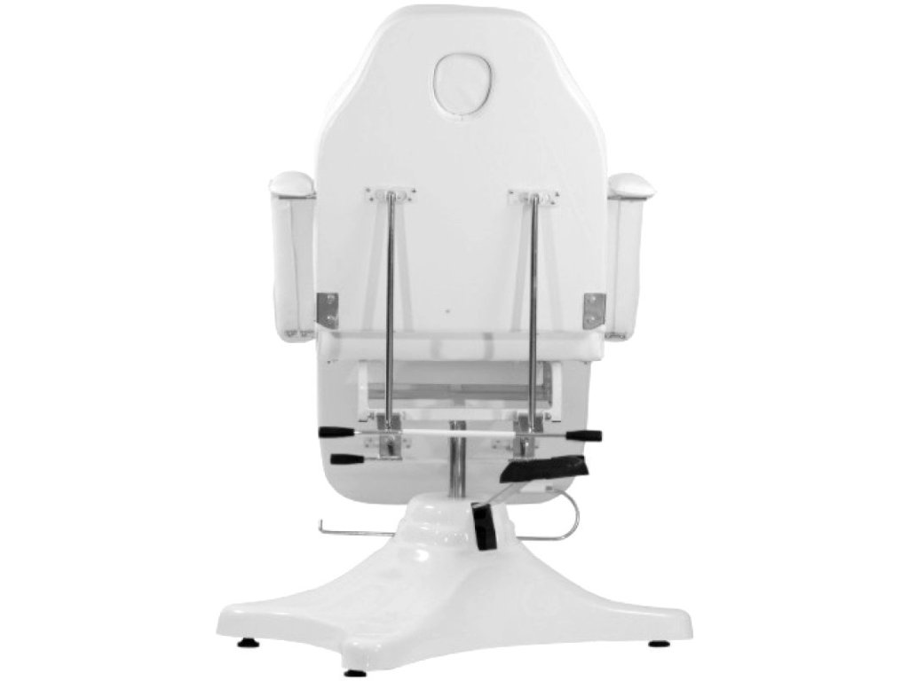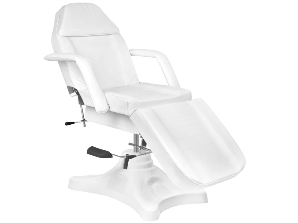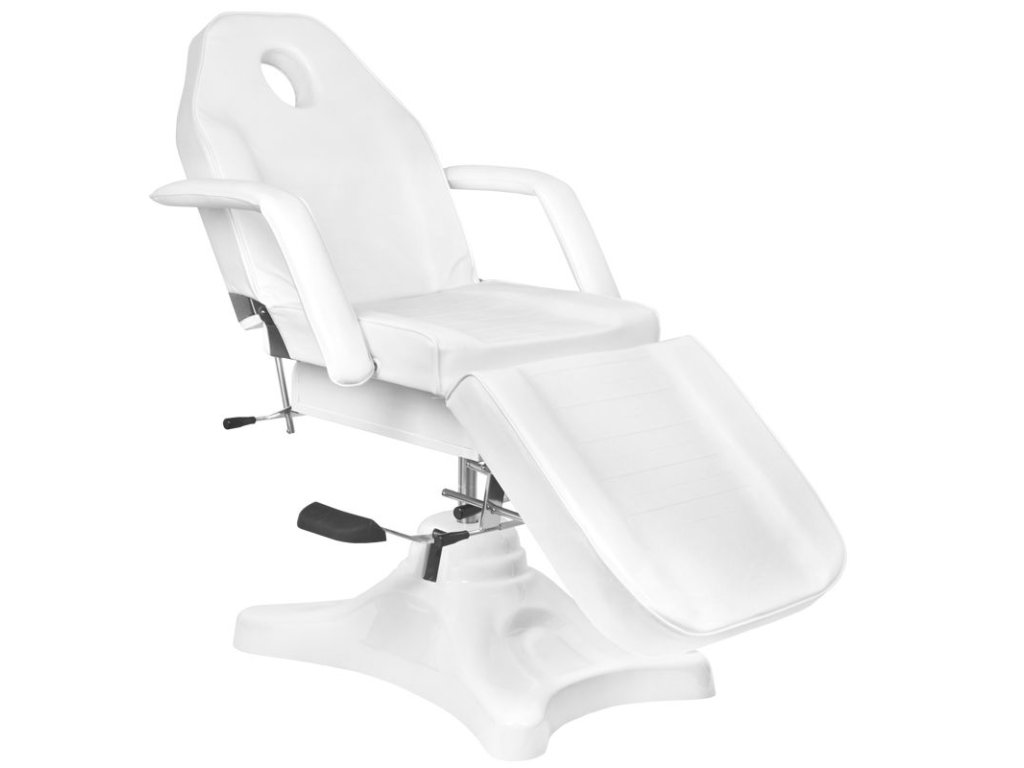mit einem Gesichtsausschnitt in der Kopfstütze. Sie ist ideal für Kosmetik, für vorteilhafte Gestaltung des Gesichts mit Make-up oder für Massage geeignet. Sie verfügt über Armlehnen und über einen Gesichtsausschnitt in der Kopfstütze, der bei Nichtgebrauch abgedeckt werden kann. Die Bespannung der Kosmetikliege ist leicht zu reinigen, aus dem Ökoleder hergestellt, erfüllt die strengen EU-Anforderungen, ist ästhetisch und besitzt vernickelte Metallteile. Unter dem Sitz ist ein Bügel für Einwegbetttuch, Servietten oder Handtuch befestigt. Die Liege ist in Weiß erhältlich.