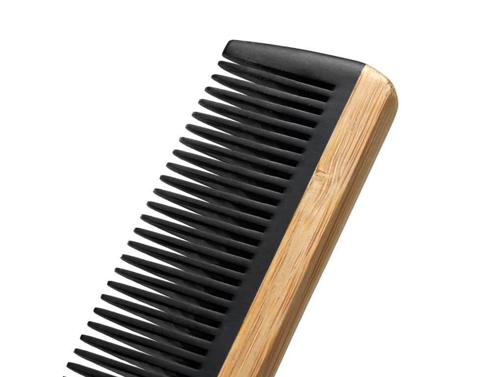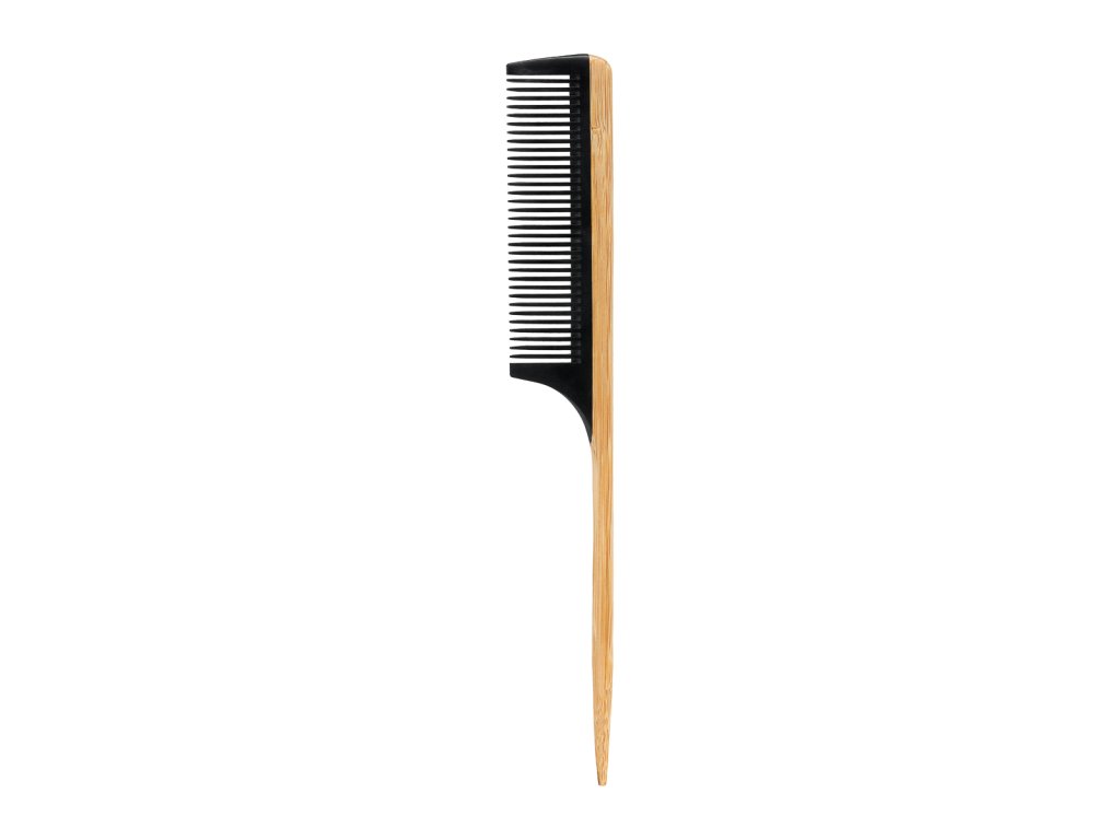Der konturierte Griff verleiht dem Kamm ein modernes Aussehen und sorgt gleichzeitig für Leichtigkeit und Bedienkomfort. Bambus ist ein ausgezeichnetes Material – ökologisch und langlebig, widerstandsfähiger gegen Feuchtigkeit als Holz. Das lange, schmale Profil sorgt für einen sicheren Halt und eine präzise Manövrierfähigkeit während des Stylings für professionelle Ergebnisse. Der Kamm ist mit feinen Zähnen in Schwarztönen ausgestattet, die das Haar schonen, das Risiko von Schäden minimieren und ihm Geschmeidigkeit und Glanz verleihen. Darüber hinaus erleichtert die spitz zulaufende Spitze des Griffs das präzise Trennen von Haarsträhnen bei komplexen Frisuren, einschließlich gleichmäßiger Scheitel oder Trennsträhnen.