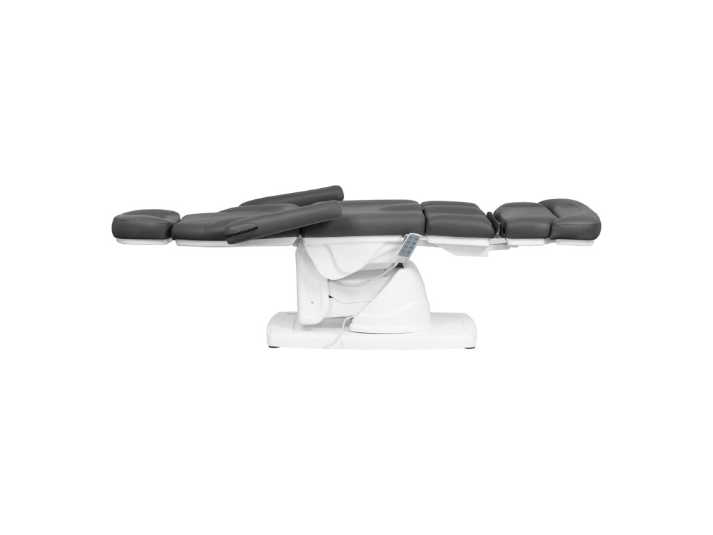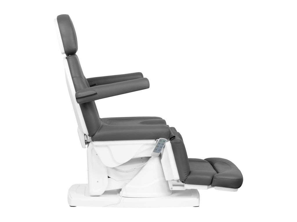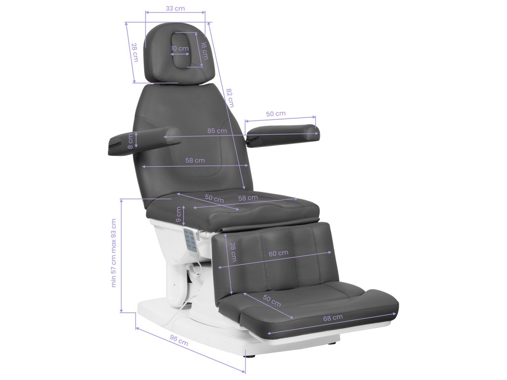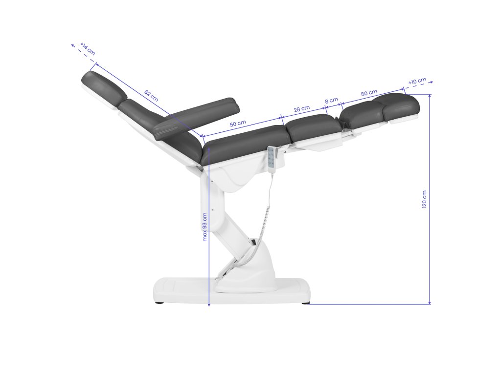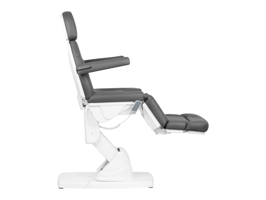 Eine moderne, elektrisch einstellbare Kosmetikliege, die einen Komfort bei der Behandlung nicht nur den Patienten, sondern auch den Personen gewährleistet, die die Behandlung durchführen. Die leisen 4 Elektromotoren ermöglichen, die Kosmetikliege schnell und bequem mit Fernbedienung einzustellen. Es besteht die Möglichkeit, den Fußschalter anzuschließen: Code 133026. Die Kosmetikliege hat einen geformten und sehr bequemen Sitz, ist widerstandsfähig und sehr stabil. Die spezielle Konstruktion der Fußstütze erleichtert die Durchführung von Pediküre und Fußpflegebehandlungen. Ein breiter Einstellungsbereich (oben – unten) ermöglicht, die Sitzhöhe individuell an die Art der Behandlung und an die Körpergröße der Person anzupassen, die die Behandlung durchführt. Ein modernes Design und eine Funktionalität in einer Sache.