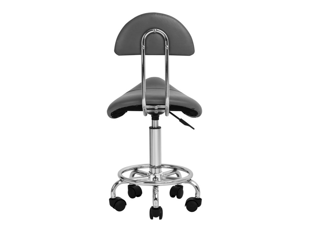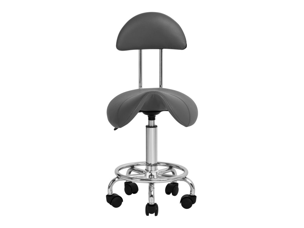 Bequemer, stabiler Kosmetikhocker mit Rückenlehne, mit profiliertem Sitz, auf einem Fünfspeichengestell mit Kunststoffrädern. Erhältlich in GRAU, ein unverzichtbares Möbelstück im Schönheitssalon.