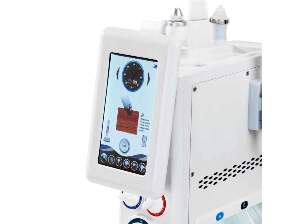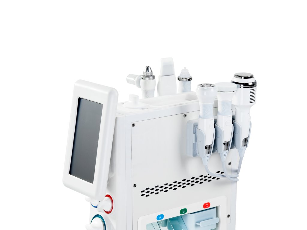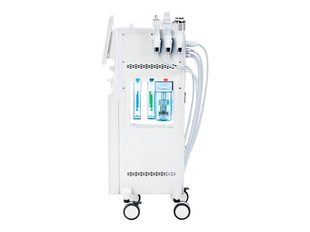 Das Hydra Pro 6 ist mit einem 7" Touchscreen ausgestattet, der eine intuitive Einstellung aller Parameter ermöglicht. Dank kompakter Abmessungen und Mobilität lässt es sich leicht im Salon bewegen. Zudem verfügt das Gerät über ein praktisches System mit Wasser- und Lösungstanks sowie Halterungen für Handstücke und Zubehör.