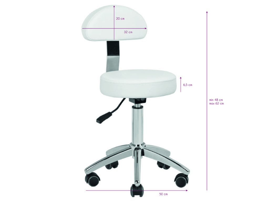 Ein bequemer und stabiler Kosmetikhocker (AM-304, weiß) verfügt über ein 5-armiges Gestell mit Gummirädern. Es besteht die Möglichkeit, die Rückenlehne zu demontieren. Der Kosmetikhocker ist in Weiß erhältlich. Er ist ein unentbehrliches Möbelstuck im Schönheitssalon.- Abmessungen: Sitz: - Durchmesser: 32 cm - Minimale Höhe: 50 cm - Maximale Höhe: 64 cm Technische Daten: - hydraulisch verstellbar - 5-armiges Gestell mit Gummirädern - Verpackungsabmessungen: 49,5 x 49,5 x 22 cm - Gewicht mit Verpackung: 7,5 kg - Verpackungsmenge: 1
