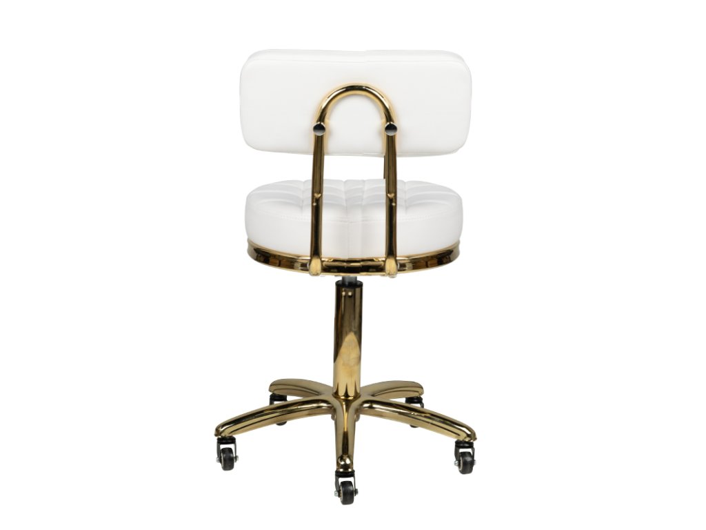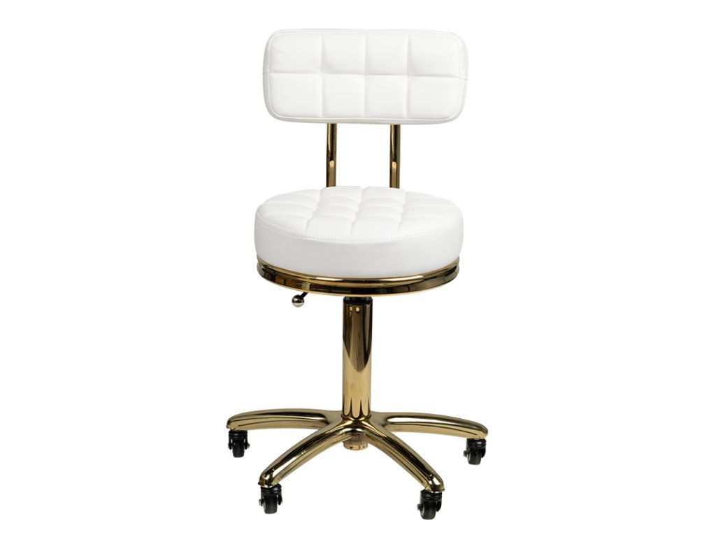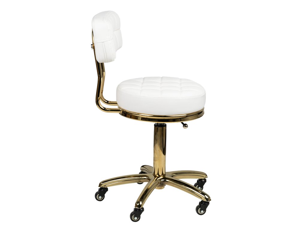 Ein einzigartiger Kosmetikhocker in Weiß mit gestepptem Sitz und bequemer Rückenlehne. Die Metallelemente glänzen wunderschön in goldener Farbe. Er ist höhenverstellbar und verfügt über ein 5-armiges Gestell mit soliden Metall-Gummi-Rollen.